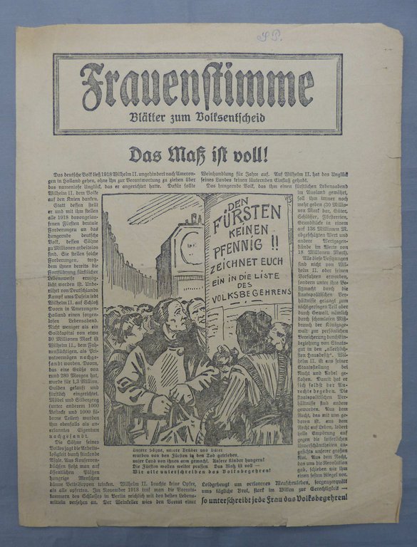 Mit schwarzweisser Illustration "Den Fürsten keinen Pfennig! Zeichnet euch ein in die Liste des Volksbegehrens!". Mit Beiträgen verschiedener Autorinnen: "Das Maß ist voll!" ohne Angabe, "Herrscher und Untertan" von Clara Bohm-Schuch, "Die Landesmütter" von Mathilde Wurm, "Die Freiheit spricht!" von Karl Bröger, "Erziehung zur Republik" ohne Angabe, "Zwei Kriegsteilnehmer" ohne Angabe, "Wichtig für jede Frau!" ohne Angabe. Mit Hinweis auf Frauenkundgebungen und Frauenveranstaltungen.