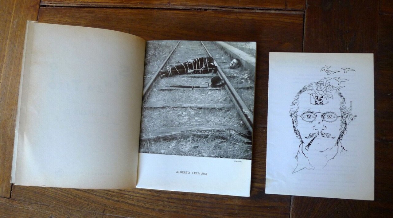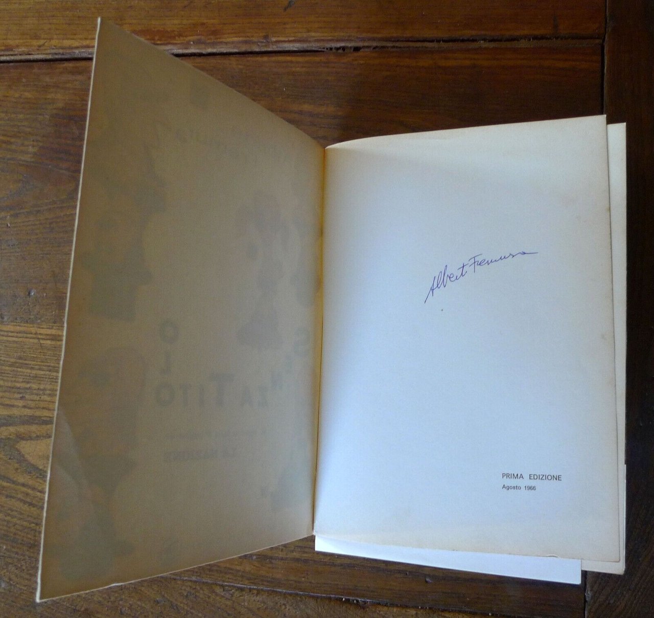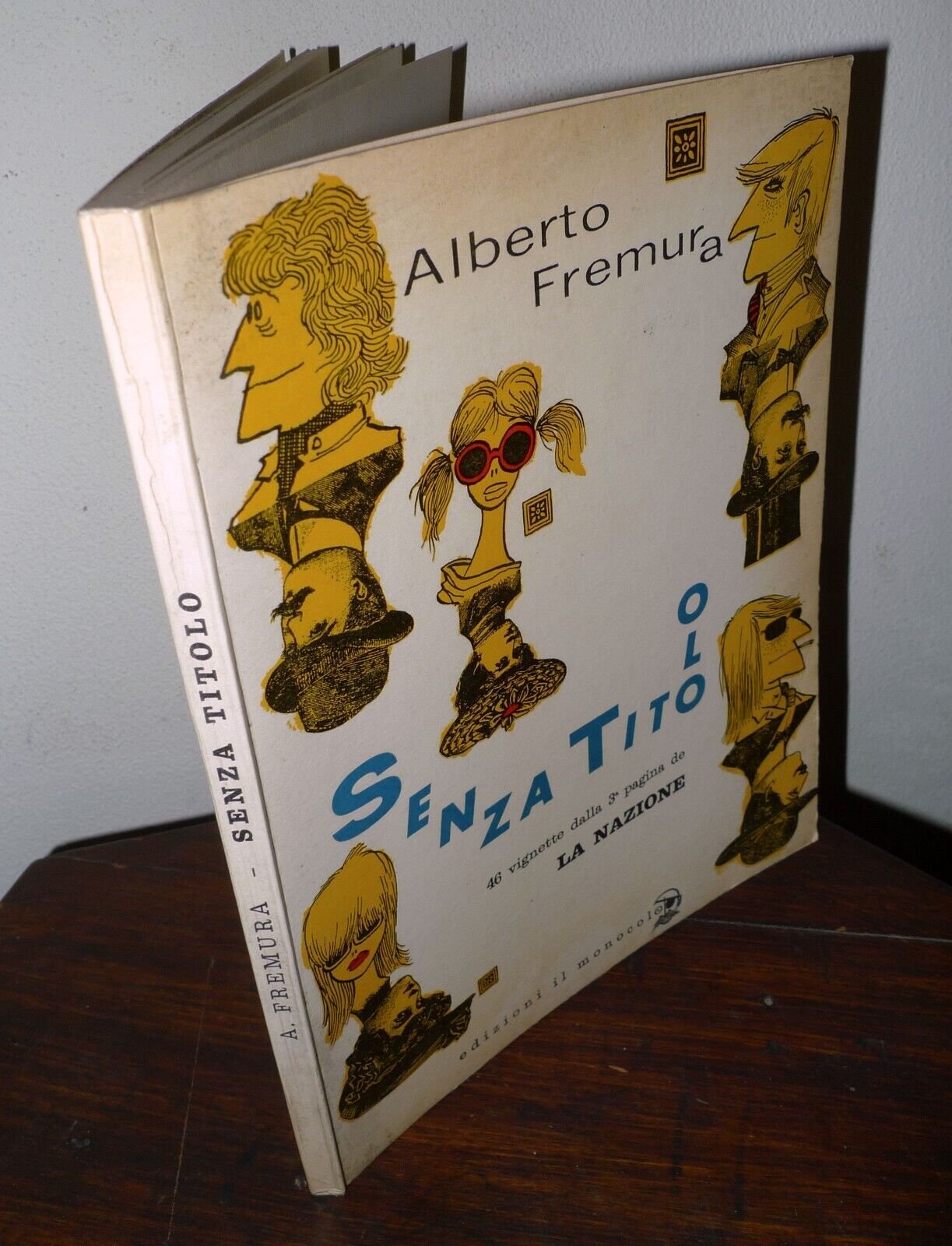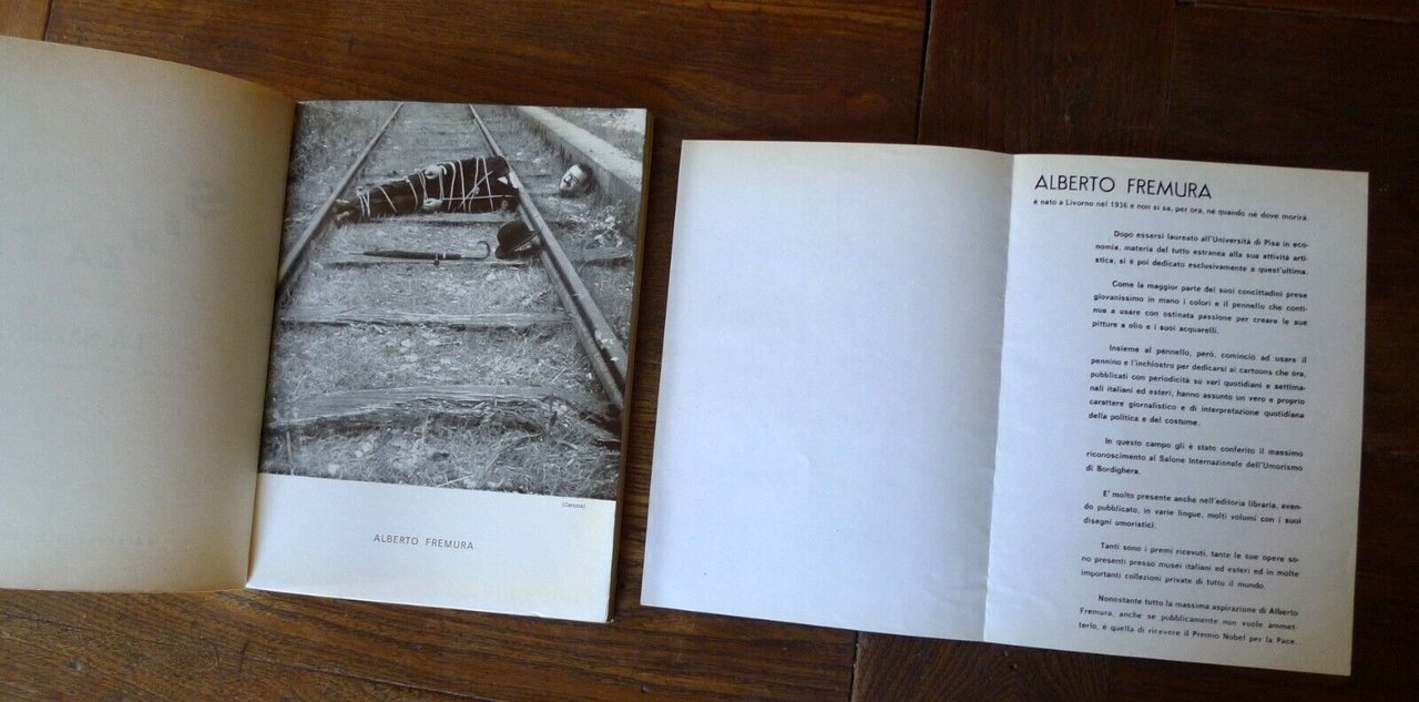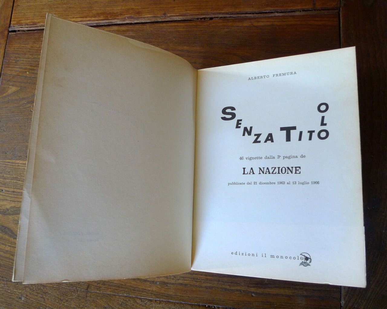 Alberto Fremura,SENZA TITOLO.46 VIGNETTE DALLA 3ª PAGINA DE LA NAZIONEpubblicate dal 21 dicembre 1963 al 13 luglio 1966Edizioni Il Monocolo / La Nazione, Firenze 1966,PRIMA EDIZIONE: agosto 1966,brossura, 23x17 cm., pagine non numerate,illustrazioni in bianco e nero,è compreso un foglio con una illustrazionee la biografia di Alberto Fremura,AUTOGRAFO DELL'AUTORE in prima pagina,peso: g.300