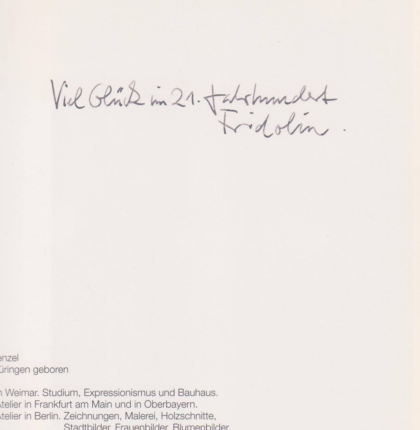 Mit Widmung des Künstlers: "Viel Glück im 21. Jahrhundert, Fridolin" auf der ersten Seite sowie Widmung seiner Frau Hanna Frenzel an Fred Riedel auf einer Postkarte. SW-Fotos von Hanna Frenzel. Mit 3 farbigen und 16 schwarzweissen Abbildungen.
