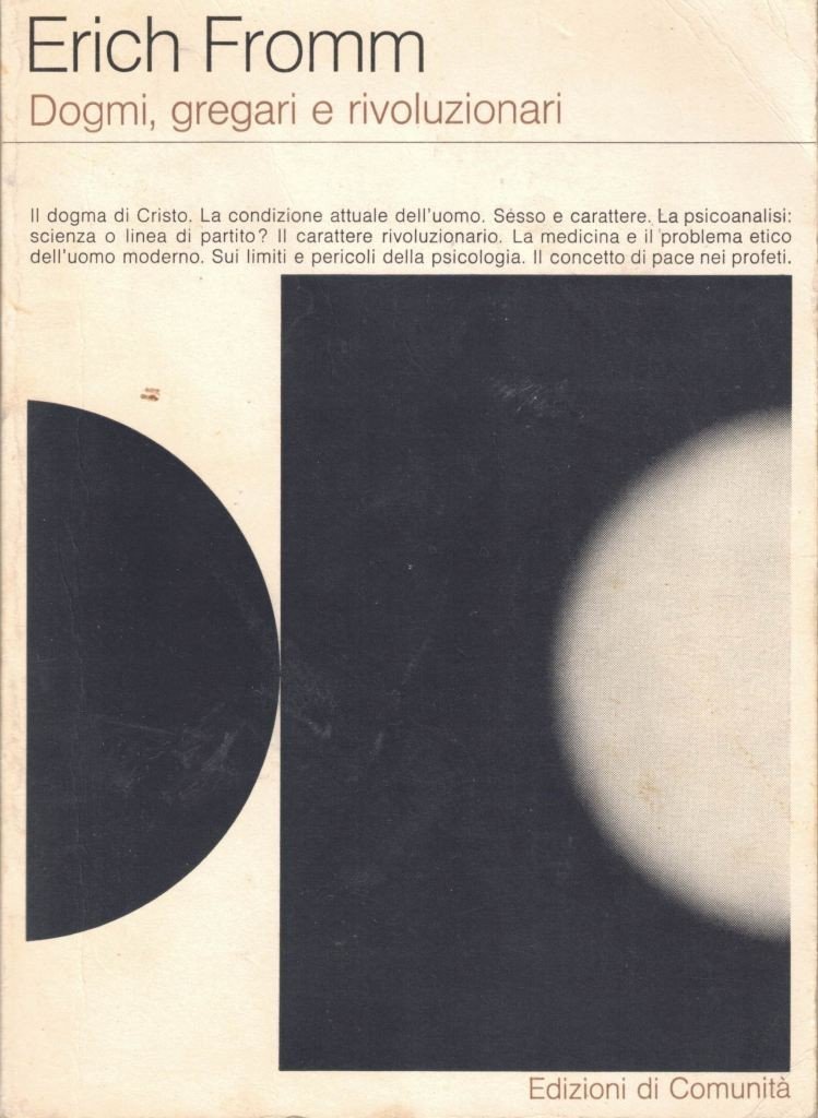 Erich Fromm, Dogmi, gregari e rivoluzionari. Saggi sulla religione, la psicologia e la cultura, Edizioni di Comunità, Milano 1979, quinta ed., pp. 216, cm 21, br. ed. Collana Saggi di cultura contemporanea, vol. 102. Titolo originale: The dogma of Christ. Traduzione di Vittorio Di Giuro. Tracce d’uso, qualche sporadic e lieve sottolineatura a lapis, minima ingiallitura dellal carta, ma nel complesso copia in condizioni ancora più che accettabili e perfettamente fruibile.