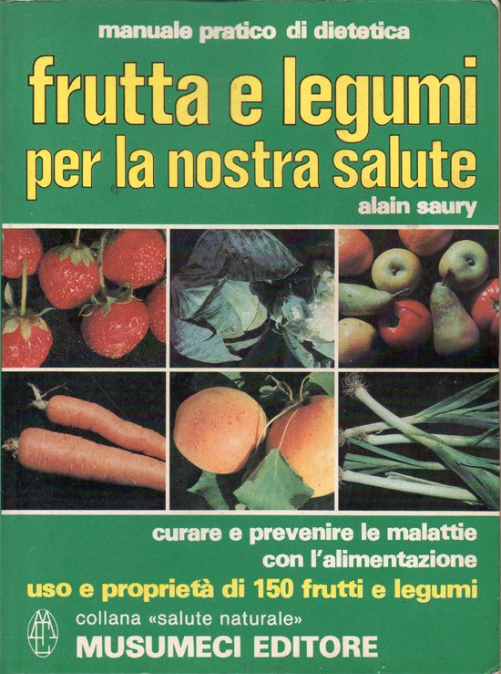 In-16° (18 x 13,4 cm), pp. 178, (6), copertina editoriale illustrata a colori. Leggero alone d'umido alla seconda di copertina e alla prima pagina. Con 150 piccole illustrazioni in bianco e nero nel testo, raffiguranti i frutti e i legumi descritti. Normale patina del tempo alle pagine, per il resto, ben conservato. Indice: Indice alfabetico della frutta e della verdura; Presentazione dell'editore; Prefazione del Dottor J. -M. Kalmar; Parte prima: introduzione dietetica. 1. Il Vangelo della Pace; 2. La masticazione; 3. Definizione degli elementi nutritivi. a) I protidi; b) I glucidi; c) I lipidi; d) Le vitamine; e) Gli oligoelementi e i sali minerali; f) L'acqua; g) La clorofilla; 4. Materiali nobili e cottura; 5. Le conserve; 6. Tabella degli alimenti secondo la compatibilità digestiva. a) Frutta; b) Altri alimenti; 7. Importanza della nutrizione; 8. Il digiuno; 9. Gli alimenti biologici. Parte seconda: manuale dietetico della frutta e delle verdure. Elenco delle abbreviazioni. Acetosa; Aglio; Albicocca; Ananas; Arachide; Arancia; Asparago; Atreplice coltivata; Avocado; Banana; Barbabietola; Bietola; Cachi; Carciofo; Carota; Castagna; Cavolo verza; Cece; Cerfoglio; Cetriolo e cetriolino; Cicoria; Ciliegia; Cipolla; Cipolla porraia; Cocomero; Cotogna; Crescione; Dattero; Dolcetta; Erba medica coltivata; Faggiola; Fagiolini; Fagiolo sgranato; Fava; Fico; Fico d'India; Finocchio; Fragola; Girasole; Gramigne; Indivia; Lampone; Lattuga; Lenticchia; Limone; Mandarino; Mandorla dolce; Mandorla indiana; Mela; Melograno; Melanzana; Melone; Mirtillo; Mora nera di gelso; Mora selvatica; Navone o napobrassica; Navone giallo; Nespola; Nocciola; Noce; Noce di cocco; Noce moscata; Oliva; Ortiche; Pastinaca; Patata; Patata dolce; Peperone; Pera; Pesca; Pinolo; Pisello; Pistacchio; Pomodoro; Porcellana; Pompelmo; Porro; Prataiolo coltivato; Prezzemolo; Prugna; Quercia marina; Rabarbaro; Radicchio nero; Radicchio rosso; Rafano; Ribes rosso o ribes comune; Ribes nero; Ruchetta; Salsefica; Sambuco rosso; Scorzonera; Sedano rapa e sedano in rami; Sesamo; Soffione; Soia; Spinacio; Tetragonia; Topinambur; Uva; Uva spina; Veccia coltivata; Zucca e zucca prodigiosa. 27 piccole schede complementari: Actinidia; Amaranto; Cacao; Caffè; Canna da zucchero; Cannella; Carruba; Chayotte; Cherimole; Colocasia; Crosne; Ginkgo; Giuggiola; Kumquat; Litchi; Liquirizia; Mango; Manioca; Noce del Brasile; Pacana; Papaia; Ravizzone d'inverno; Tartufo nero; Vaniglia; Zenzero; Zucca a berlingozzo; Zucchino italiano. Parte terza: allegati. I dieci cereali. Avena - Frumento - Grano saraceno - Mais - Miglio - Orzo - Riso - Segala - Sorgo - Spelta; Repertorio dei periodi della frutta e delle verdure; Indice alfabetico dei nomi scientifici; Bibliografia; Indice.