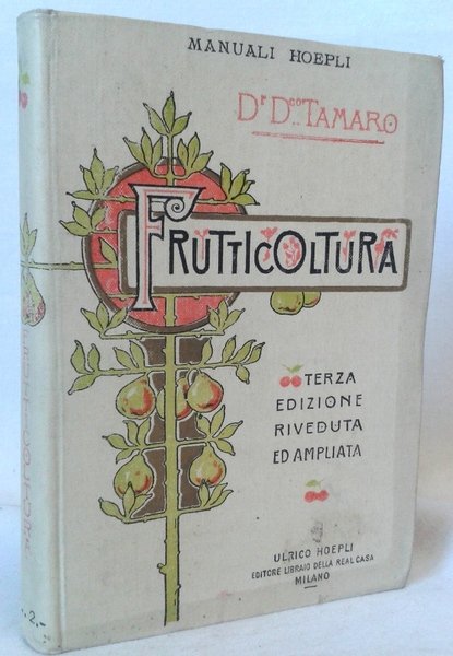 Volume in 12 legato in tela editoriale figurata, titolo al piatto ed al dorso, tagli colorati, sguardie editoriali, frontespizio stampato a due colori, indici, prefazioni, XVIII - 219 pp, 81 incisioni intercalate n.t., 64 pp. di elenco completo di manuali hoepli. Approfondito preciso e tecnicamente affidabile manuale sulla frutticoltura, redatto dal Direttore della Regia scuola di Agricoltura della Liguria. La moltiplicazione delle piante da frutto, la potatura, i sistemi di coltivazione, la concimazione ed irrigazione, la raccolta e la conservazione e utilizzazione della frutta, le malattie e cause nemiche. Il testo integrato da disegni illustrativi sulle varie metodologie e specie e da tabelle statistiche. Stato di conservazione pi che buono.