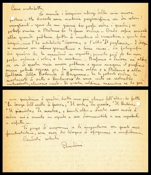 lettera manoscritta e firmata del pittore Fulvio Pendini in cui scrive a Gio Ponti di una nuova tecnica pittorica con colori smaglianti che nessuno ha mai visto e gli chiede di mostrarla a Barbaroux; lettere di 2 facciate; buon es.