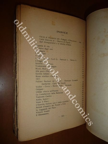 TITOLO: FUOCO E SCINTILLE DA LO STELVIO AL MARE - VISIONI DI BATTAGLIE E GESTA D'EROI DESCRIZIONE: Ed. Biancardi, Lodi, 1927-V. In 16°, br. ed. bianca con fregio oro in rilievo al piatto, pp. 348 Episodi eroici della Prima Guerra Mondiale. Guardare l'indice completo in foto, per i personaggi e i luoghi citati dal testo. CONDIZIONI: Buone. Fioriture e qualche segno del tempo, leg. riparata. PESO / WEIGHT: 350 gr. without package