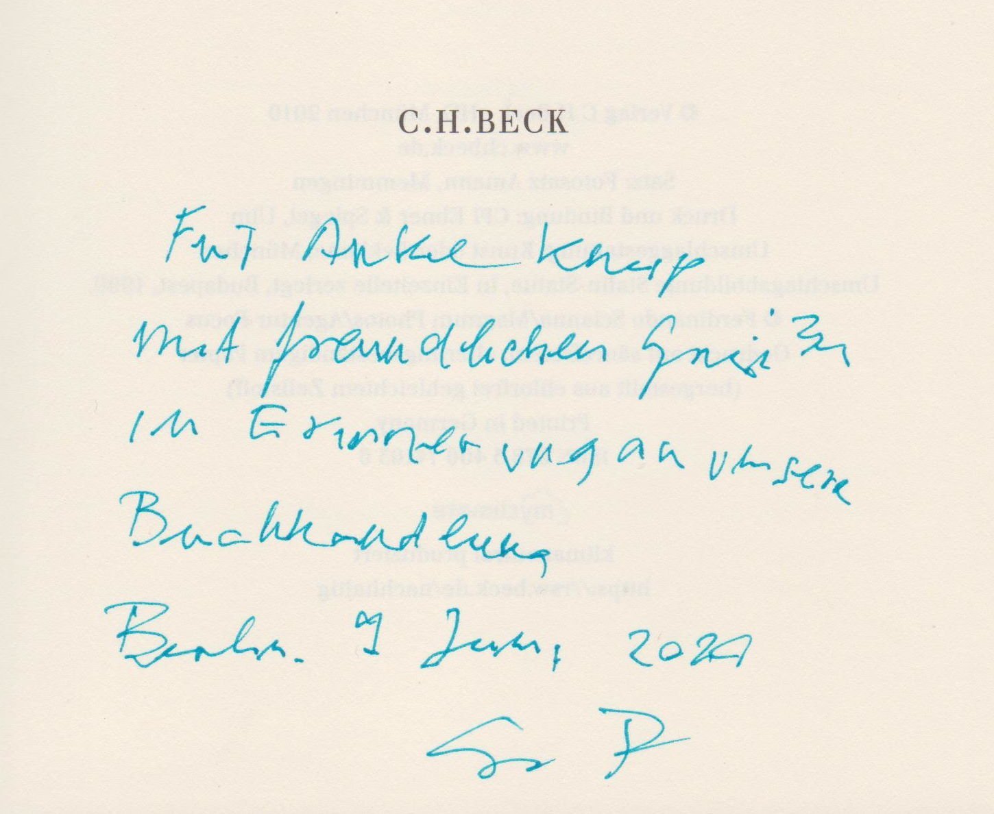 Mit einer schönen Widmung ("In Erinnerung an unsere Buchhandlung") für die ehemalige Buchhändlerin der bedeutenden Autorenbuchhandlung in Westberlin und der Signatur des Autors auf dem Titelblatt (2020).