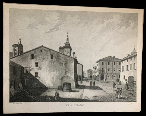 31,9×41,6 cm; bella e celebre incisione in rame allacquaforte rappresentante una veduta del centro di fu Fusignano. In basso a destraB. Rosaspina inc., in basso a sinistra L. Ricciardelli dis.. Esemplare in ottime condizioni di conservazione. Il foglio venne pubblicato in una serie di tavole realizzate da Bernardo Rosaspina, dal titolo Ventisette incisioni rappresentanti diversi luoghi della Romagna disegnati stampati in anni diversi tra il 1830 ed il 1840. Bernardino Rosaspina (Bologna 1797 Bologna 1882), appartenente ad una celeberrima famiglia di incisori, era figlio di Giuseppe (Bologna 1765 ivi 1832), e nipote di Francesco (Montescudo, Rimini, 1762 Bologna 1841). Bernardino, conosciuto anche come Bernardo, concentrò la sua arte nella realizzazione di vedute che divennero ben presto molto apprezzate e richieste per la pulizia del tratto. Foglio in ottime condizioni di conservazione.