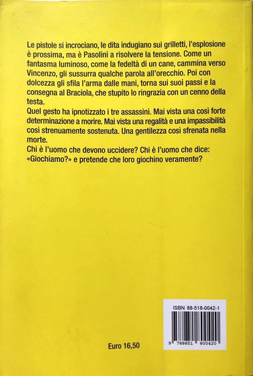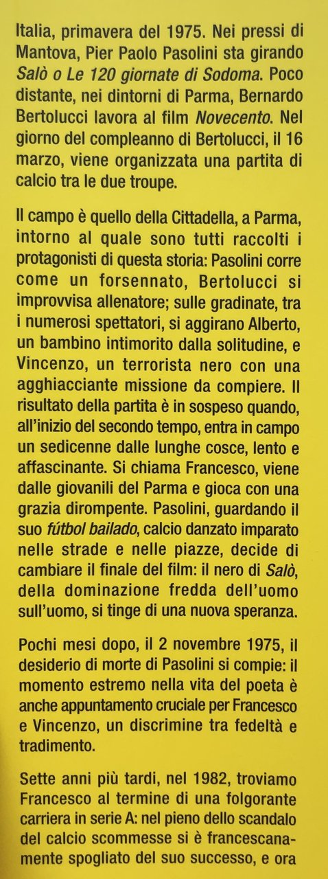 Soggetti: Narrativa contemporanea, Romanzi Storici, Letteratura italiana, Calcio danzato, Giochi di strada, Cinema, Resistenza, Salò, Novecento, Pier Paolo Bernardo Troupe, Partita Sfide, Scommesse, Anni Ottanta Settanta, Mondiali 1982 Spagna Mundiàl Francesco Ferrari, Anni di piombo, Terrorismo, Registi italiani, Racconti, Storia d'Italia, Strage, Heysel, Spiritualità, Vita di San Francesco, Passione di Cristo, Gesù, Saghe, Sport, Giocatori, Miti, Cultura calcistica, Fedeltà, Tradimenti, Amicizia, Paolo Rossi, Cabrini, Scirea, Serie A, Gazzetta Ostia, Sabaudia, Porzus, Torino, Ronda, Provenza, Francia, Giovanili, Fantasy, Fiction, Libri fuori catalogo,Contemporary fiction, Novels, Italian Literature, Soccer danced, Street games, Resistance, Football matches, Challenges, Bets, Eighties, Seventies, World Cup, Spain, Years of lead, Terrorism, Italian directors, Stories, History of Italy, Massacres, Lettura Collezionismo Spirituality, Life of Saint Francis, Passion Christ, Jesus, Sagas, Players, Myths, Culture, Loyalty, Betrayal, Friendship, Serie A, Turin, Provence, France, Youth, Books out of print