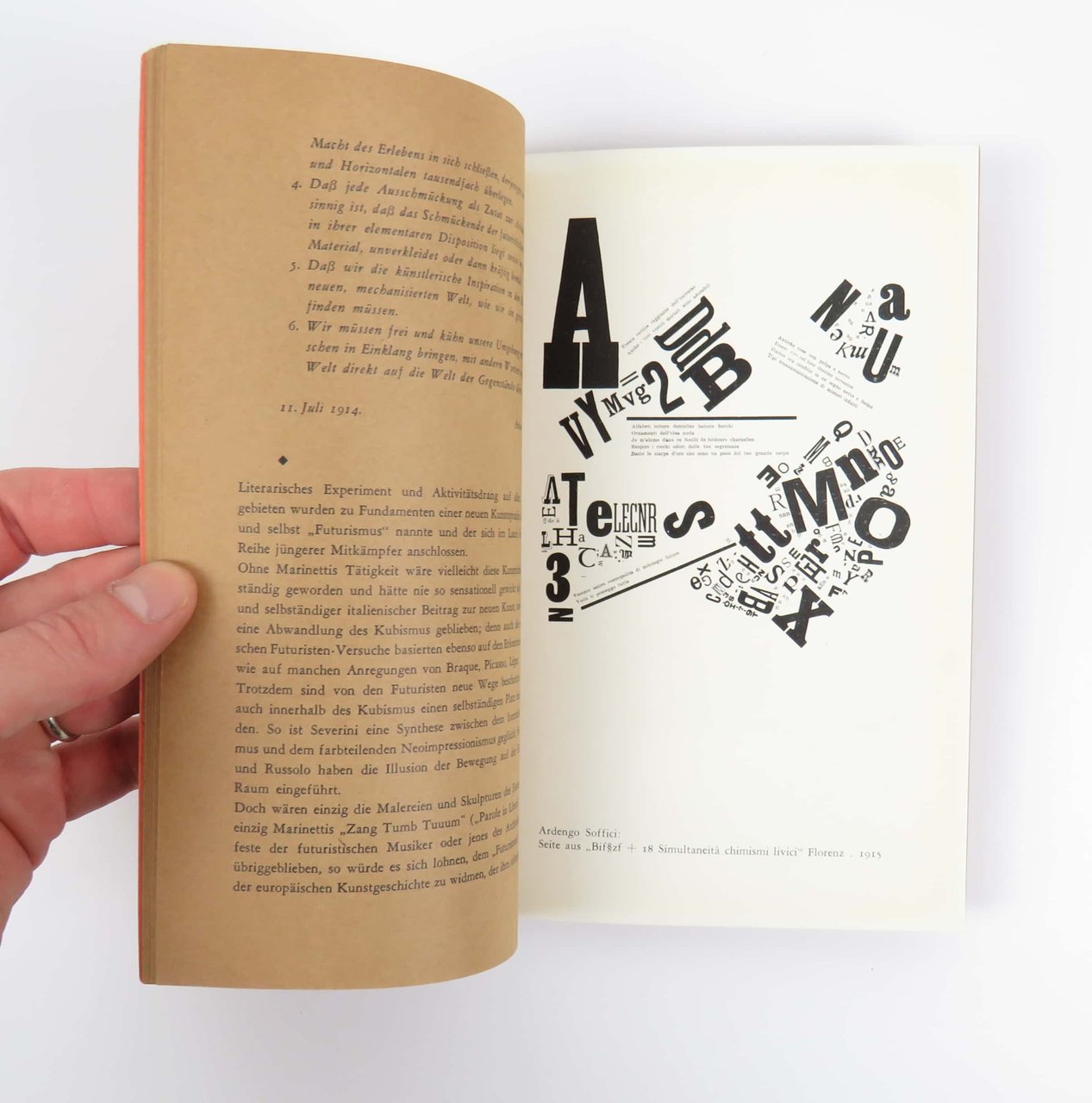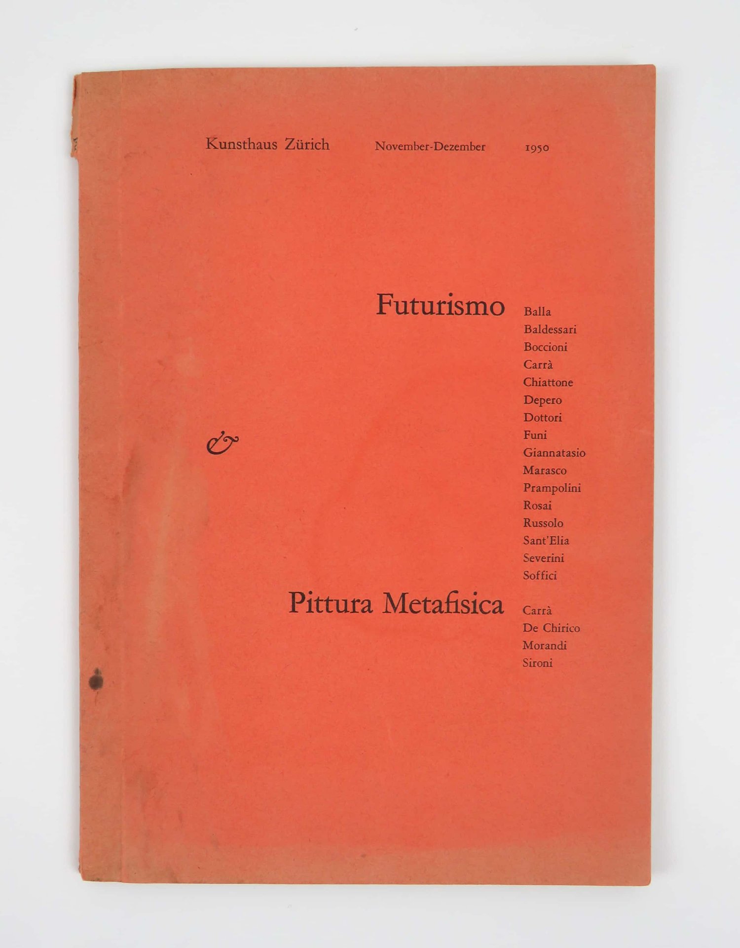 LIBROEdizione originale.Straordinario esemplare con la firma autografa in quarta di copertina del grande collezionista Riccardo Jucker.Catalogo della storica mostra tenutasi nel novembre-dicembre 1950 alla Kunsthaus di Zurigo, curata dal grande grafico e connoisseur Max Bill. Una delle prime retrospettive significative del dopoguerra. Introduzione di R. Wherli, segue uno scritto di Max Bill a cui sono intercalati — tradotti in tedesco — il manifesto di fondazione del futurismo, di Marinetti; il «Manifesto tecnico dei pittori futuristi», di Boccioni, Carrà, Russolo, Balla e Severini; il «Manifesto tecnico della scultura futurista», di Boccioni; il «Manifesto dell’architettura futurista», di Sant’Elia; l’articolo di Carrà apparso sul primo numero di «Valori plastici» (15 nov. 1918), che commenta il quadro «Ovale delle apparizioni».