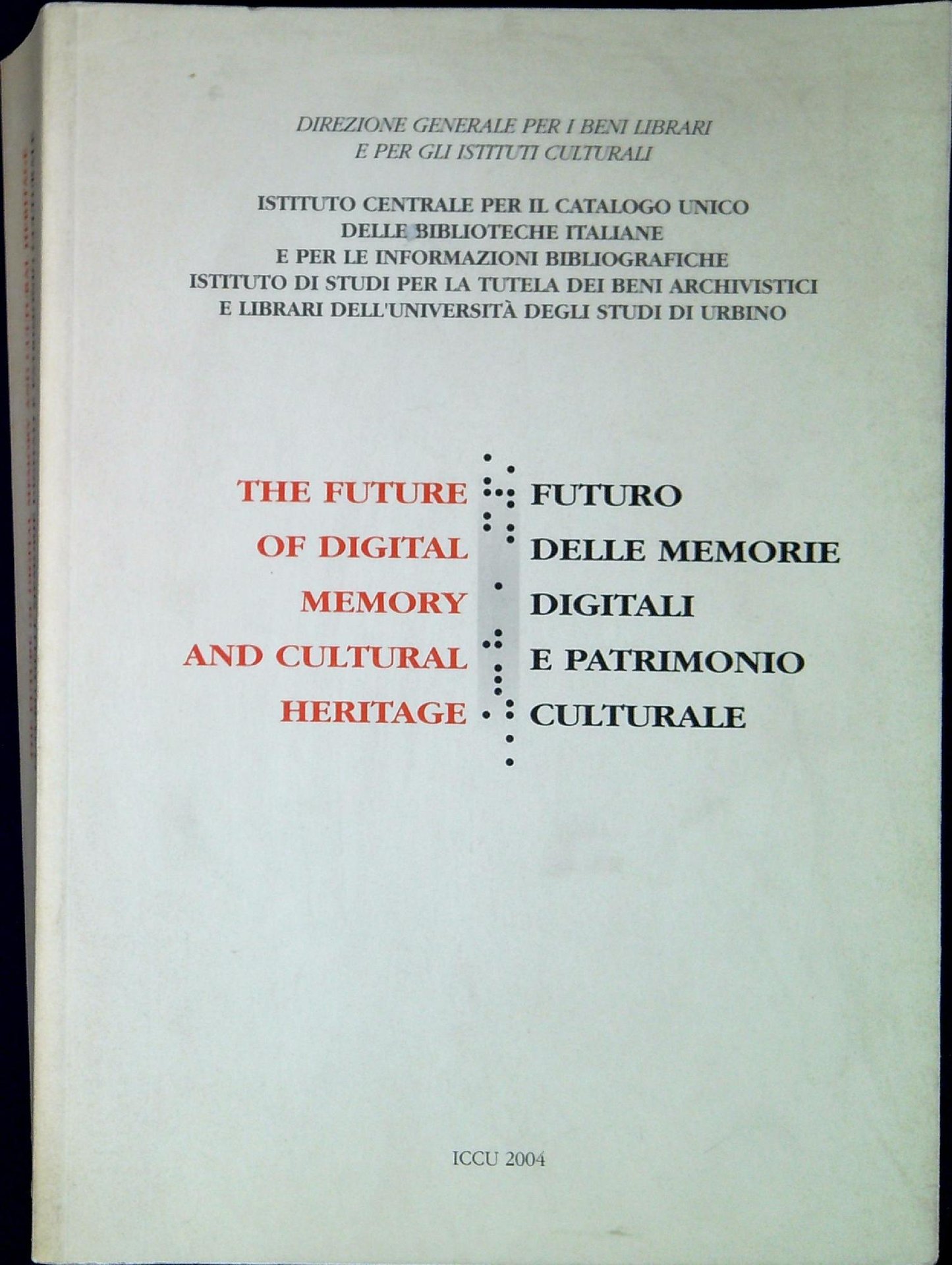 AA.VV. Futuro delle memorie digitali e patrimonio culturale : atti del Convegno internazionale, Firenze, 16-17 ottobre 2003. Roma, ICCU 2004, 330, 350 p. : ill. ; 24 cm  (48731)