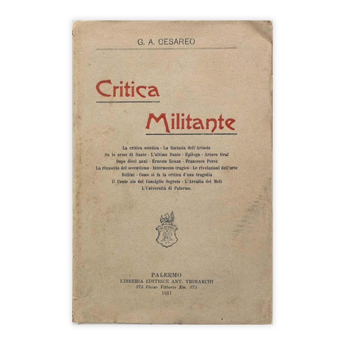 Autore: G.A. Cesareo Titolo: Critica Militante Sottotitolo: La critica estetica- La fantasia dell'Ariosto, Su le orme di Dante - L'ultimo Dante - Epilogo - Arturo Graf, Dopo dieci anni - Ernesto Renan - Francesco Perez; La rinascita del secentismo - Intermezzo tragico - Le rivelazione dell'arte; Bellini - Come si fa la critica d'una tragedia; Il Conte zio del Consiglio Segreto - L'Arcadia del Meli - L'Università di Palermo. Edizione: Palermo, Libreria Editrice Ant. Trimarchi 1911 Dimensioni: 13,5 x 20,5 cm c.a. Pagine: 333 Copertina: Brossura Condizioni: Ottime come da foto