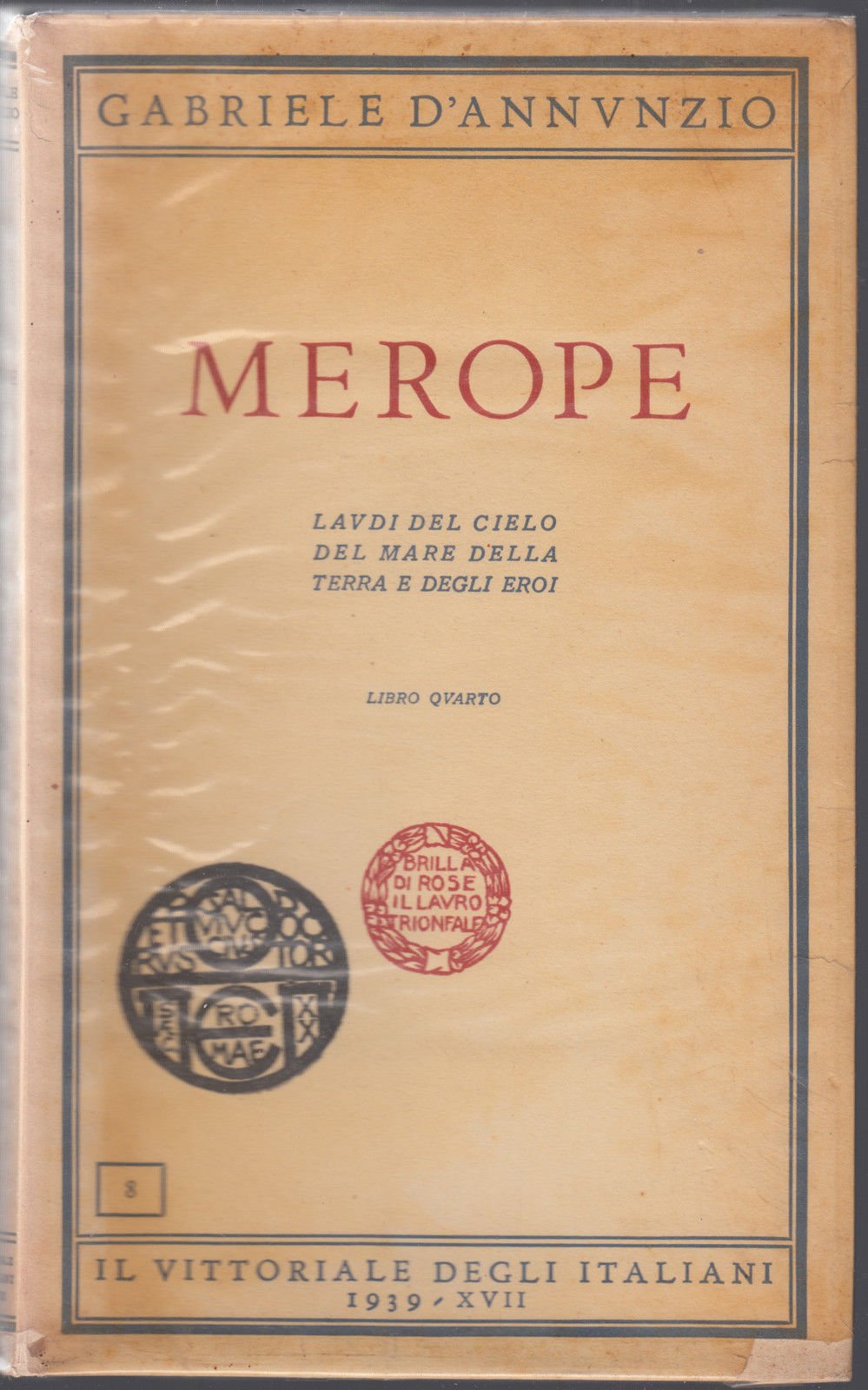 GABRIELE D'ANNUNZIO MEROPE LIBRO QUARTO VITTORIALE DEGLI ITALIANI 1939----- SOVRACCOPERTA TRASPARENTE A PROTEZIONE COPERTINA MORBIDA EDITORIALE INTERNO IN BUONO STATO, TAGLI IRREGOLARI N. PAG. 155 CM. 20,5 X 13