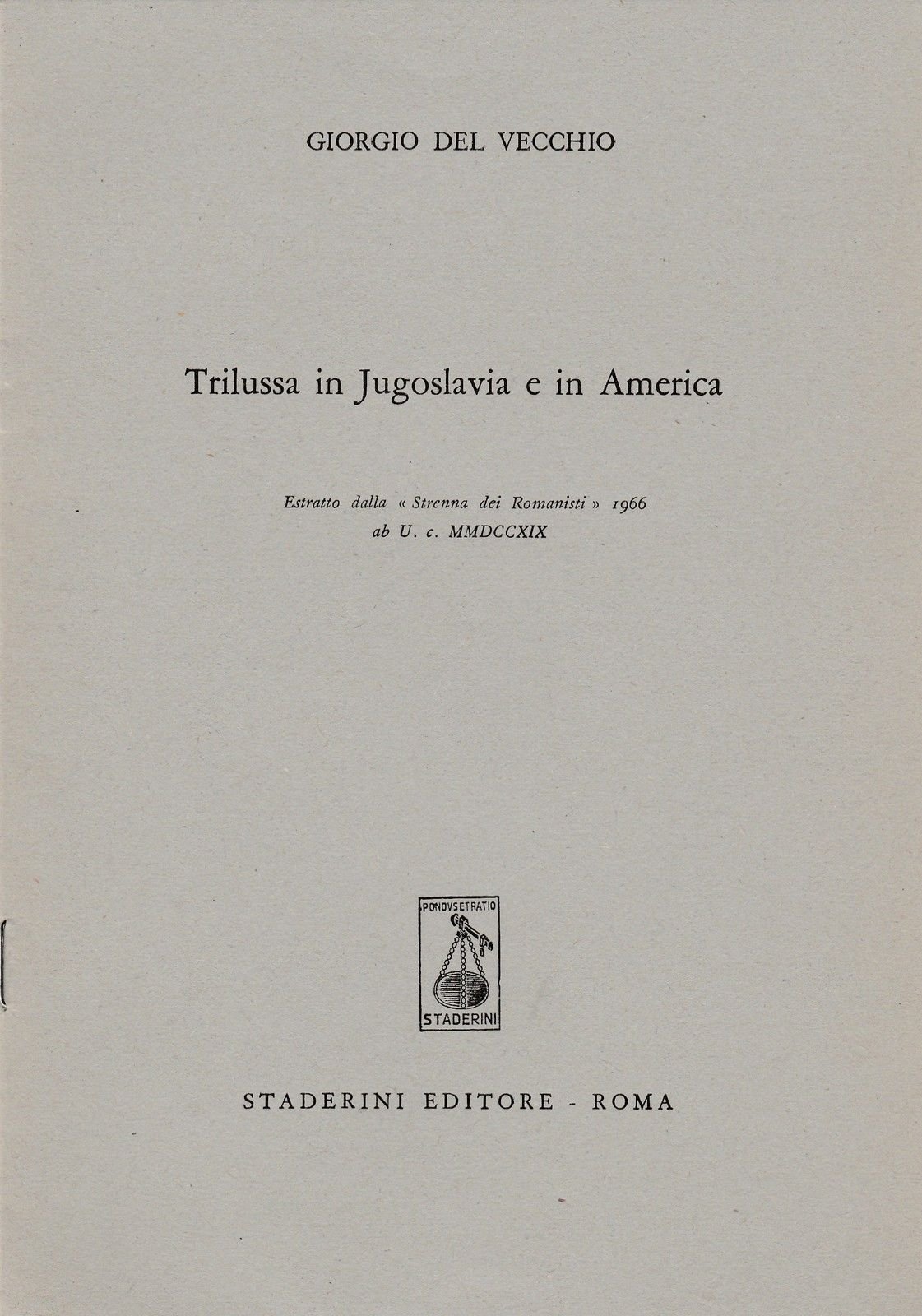 GIORGIO DEL VECCHIO TRILUSSA IN JUGOSLAVIA E IN AMERICA ESTRATTO DALLA STRENNA DEI ROMANISTI1966 STADERINI ED. ROMA L 4541 COPERTINA EDITORIALE MORBIDA, INTERNO IN OTTIMO STATO N. PAG. 6 CM. 20,5 X 14,5
