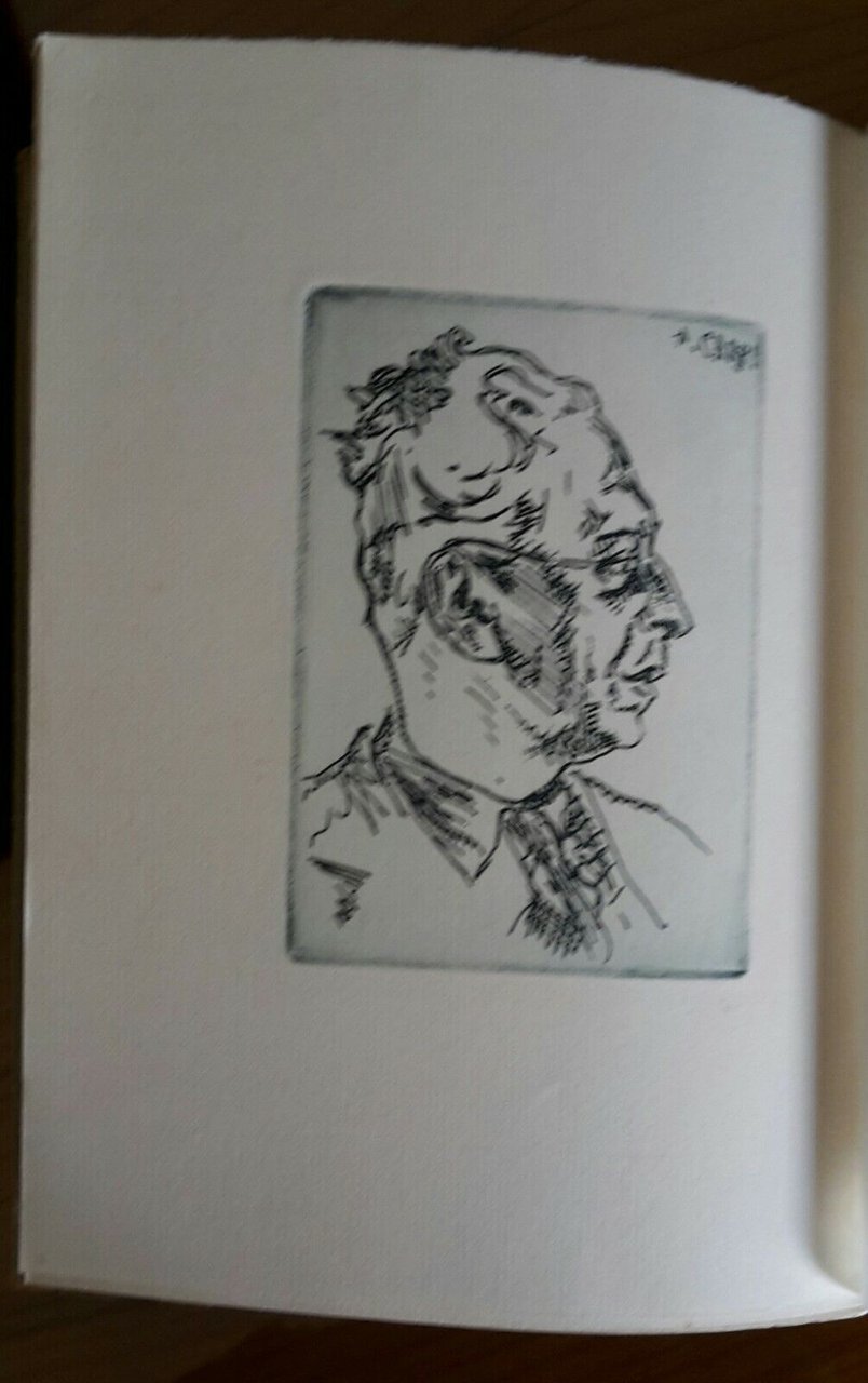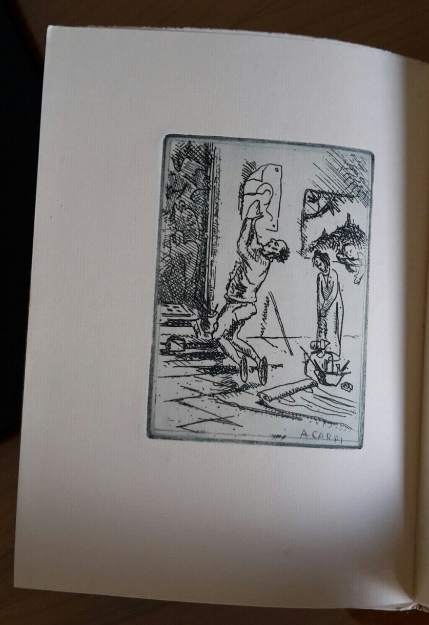 In 8°, pag. 86, legatura editoriale, copertina illustrata, sovracopertina in pergamino, due acqueforti di aldo carpi, pagine in barbe.