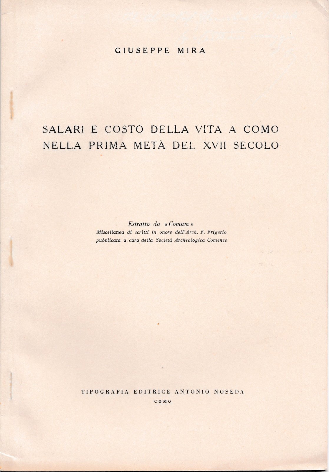 Giuseppe mira salari e costo della vita a Como nella prima met‡ del xvii secolo estratto da comun miscellanea di scritti in onore dell'arch. F. Friggerlo pubblicata a cura della societ‡ archeologica comense tipografia editrice Antonio Nosema senza data