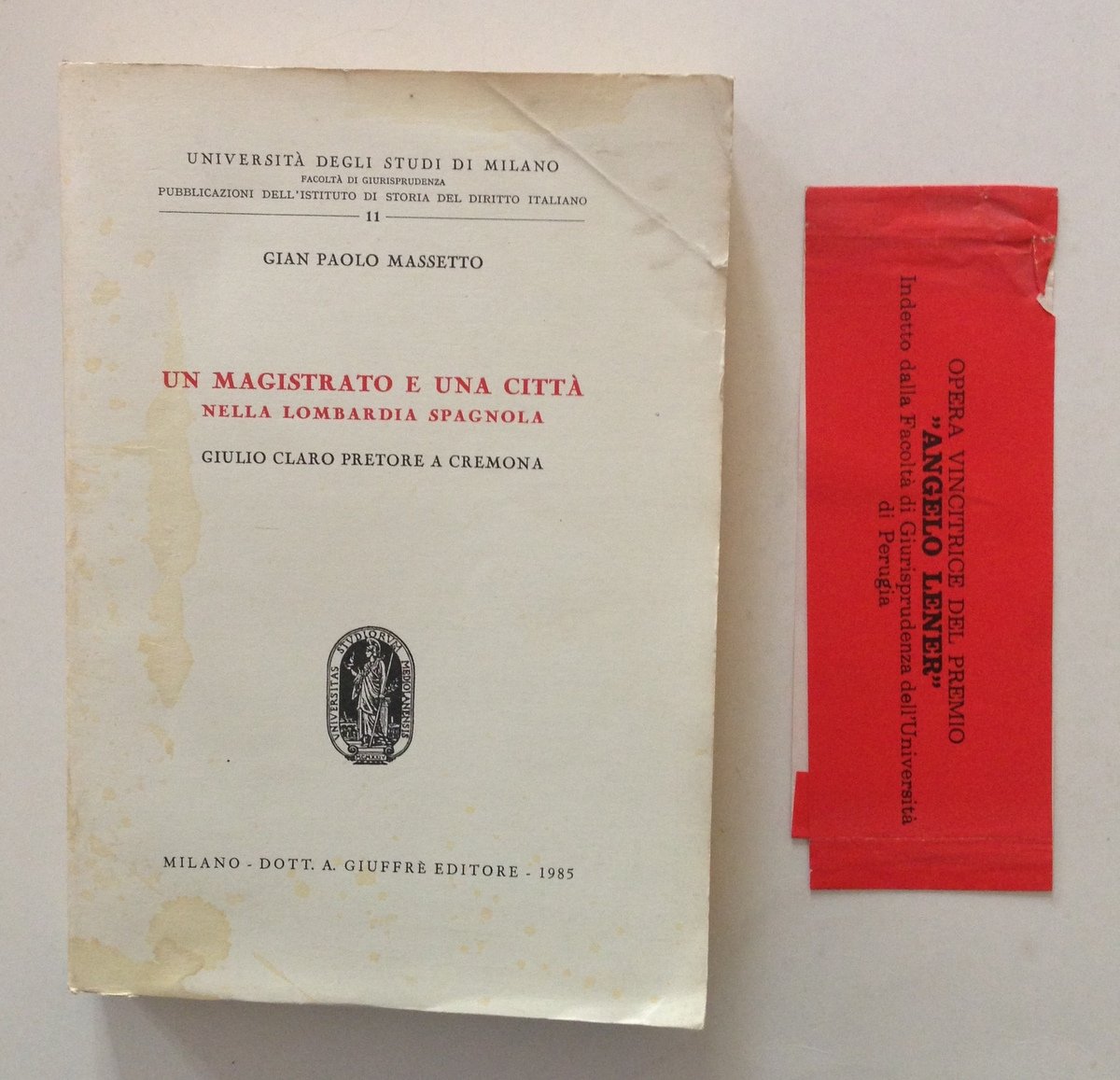 G. P. Massetto, Un magistrato e una città nella Lombardia spagnola Giuffrè Editore, Milano 1985; cm 25x17.5; pp. 417, con dedica autografa dell'autore alla prima bianca; br. ed., annessa fascetta vincitrice premio Angelo Lener". Condizioni di conservazione Esemplare ben conservato con leggere tracce d'uso; brossura editoriale con minime pieghette agli angoli, minimi strappetti ai margini e qualche macchia e alone; interni leggermente bruniti. SETT130.L12854 MT "