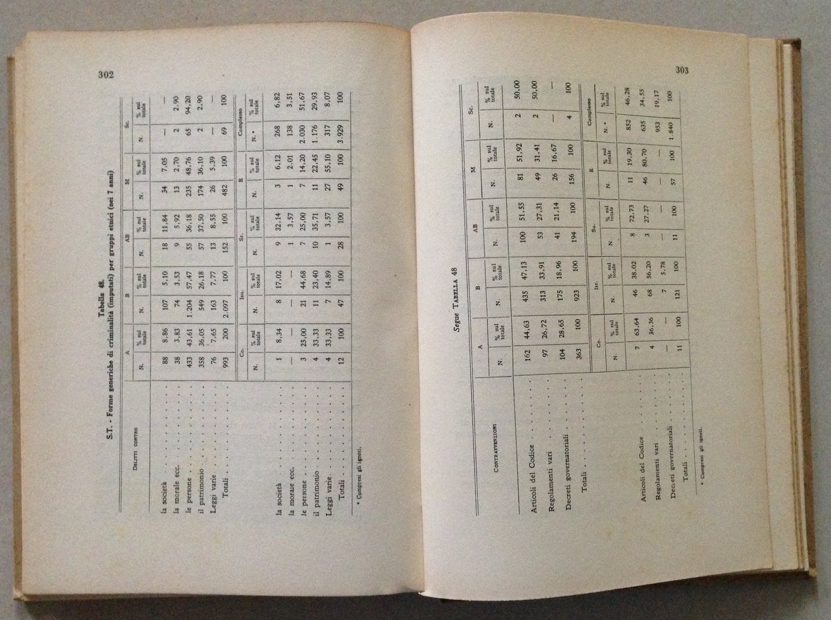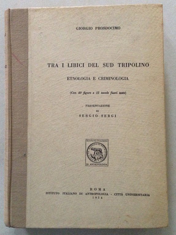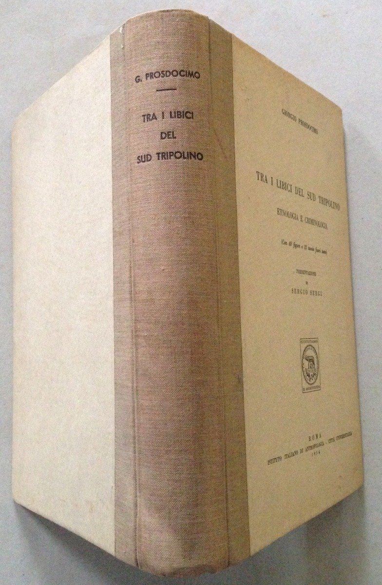 G. Prosdocimo, Tra i libici del sud Tripolino Etnologia e criminologia Istituto Italiano di Antropologia -Città Universitaria, Roma, 1954; cm. 24,5x17,5; pp. 340; con 40 figg e 12 tavv. f.t.; presentazione di Sergio Sergi; cartonato ed. Condizioni di conservazione Esemplare in buono stato con leggere tracce d'uso. SETT169.L15472 MT