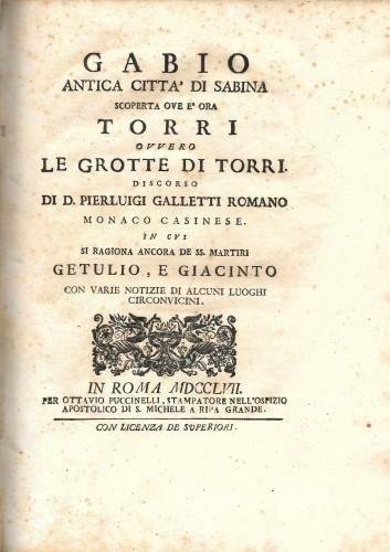 GABIO antica citta' di Sabina scoperta ove è ora Torri ovvero le Grotte di Torri. Discorso di D. Pierluigi Galletti romano monaco casinese. in cui si ragiona ancora de SS. martiri Getulio, e Giacinto con varie notizie di alcuni luoghi circonvicini