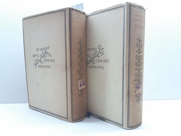 sovraccoperta editoriale in condizioni accettabili, bruniture diffuse al dorso ed etichetta di catalogazione, segni del tempo e alcuni aloni, legatura rigida in tela azzurra con fregi al piatto anteriore e al dorso, titolo in oro al dorso, tagli superiori colorati, alcune fioriture ai tagli, volume primo: dedica ed ex libris alla prima pagina bianca, incisione dell'autore al frontespizio protetto da velina, interno in buono stato numero pagine 1231, tasca con facsimile di lettere di D'Annunzio, volume secondo: ex-libris alla prima pagina bianca, interno in buono stato alla terza di copertina tasca con facsimile lettere di D'Annunzio numero pagine 1199 dimensione di ciascun volume cm 20 x 14 x 4,5