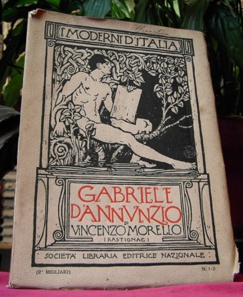 Volume in 8, brossura editoriale figurata, titolo al piatto ed al dorso, antiporta con ritratto del poeta, frontespizio, prefazione, 106, (6) pp., 6 tavole ft. di cui una grande (cm. 54 x 25) ripiegata al fondo del volume che riproduce una lettera autografa di D'Annunzio, alcune illustrazioni e fax simili nel testo. Acclusi al volume, in oltre, alcuni articoli 'dannunziani' di giornali d'epoca, conservati dal precedente proprietario. Un bel saggio biografico in cui l'autore si sofferma sugli elementi interni ed esterni della vita intellettuale e dell'opera del Vate. Rappresentativo e gradevole da leggere, arricchito dalle belle illustrazioni e dagli interessanti articoli aggiunti. In bello stato.