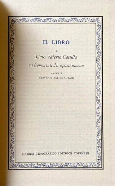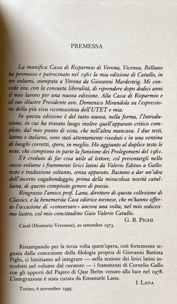La munifica Cassa di Risparmio di Verona, Vicenza, Belluno ha promosso e patrocinato nel 1961 la mia edizione di Catullo, in tre volumi, stampata a Verona da Giovanni Mardesteig. Mi concede ora, con la consueta liberalità, di riprendere dopo dodici anni il mio lavoro per una nuova edizione. Alla Cassa di Risparmio e al suo illustre Presidente avv. Domenico Mirandola va l'espressione della più viva riconoscenza dell'UTET e mia. In questa edizione è del tutto nuova, nella forma, l'introduzione, in cui ha trovato luogo inoltre quell'apparato critico completo, dal mio punto di vista, che nell'altra mancava. I due testi, latino e italiano, sono stati attentamente riveduti e in una ventina di luoghi corretti, spero, in meglio. Ho aggiunto al duplice testo le note, che compiono in parte la funzione dei Prolegomeni del 1961. S'è creduto di far cosa utile al lettore, col presentargli nello stesso volume i frammenti lirici latini da Valerio Edituo a Gallo: testo e traduzione soltanto, senza apparato. Bastano a dar un'idea dell'incerto vagabondaggio, prima della miracolosa novità catulliana, di questo composito genere di poesia. Ringrazio l'amico prof. Lana, direttore di questa collezione di Classici, e la benemerita Casa editrice torinese, che m'hanno offerto l'occasione di conversare ancora una volta, nel mio sedicesimo lustro, col mio concittadino Gaio Valerio Catullo. G. B. PIGHI Casal (Montorio Veronese), 20 settembre 1973.