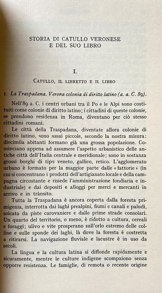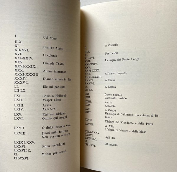 Indice dal sommario: Premessa - Introduzione: Storia di Catullo Veronese e del suo Libro (Catullo, il Libretto e il Libro, Storia del Libro, Apparato critico, Appendice). I frammenti lirici. Catulli Veronensis Liber. Fragmenta Lyricorum Latinorum Qui Ab Acciana Ad Catullianam Aetatem Fuerunt. Indici (dei metri, dei capoversi di Catullo, dei nomi. Prospetto comparativo con le edizioni del Pascoli, del Morel e del Traglia). Indice della tavole (n. VI tavole in bianco e nero fuori testo).