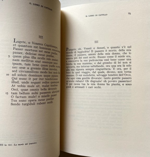 Catullo, massimo esponente della scuola dei poeti nuovi ispirati al greco Callimaco, lascia una produzione poetica giunta a noi in forma di Liber, successivamente suddiviso in tre parti: le nugae, brevi carmi in metri diversi; i carmina docta d'impronta alessandrina, per la maggior parte in esametri e distici elegiaci; e gli epigrammi composti in distici elegiaci. Si tratta di una forma di poesia breve e erudita, attenta al tratteggio di episodi semplici e quotidiani di evidente matrice callimachea. L'opera di Catullo, appartenente alla scuola dei poeti nuovi ispirati al greco Callimaco, giunge a noi in forma di Liber, successivamente suddiviso in tre parti. Le nugae, brevi carmi in metri diversi, i carmina docta d'impronta e l'ultima con gli epigrammi composti in distici elegiaci. Minimo comune denominatore è il tratteggio di episodi semplici e quotidiani di evidente matrice callimachea. Una forma di poesia breve e erudita. La versione del Liber catulliano si completa dei frammenti lirici di altri poeti minori, tra cui: Valerio Edìtuo, Q. Lutazio Càtulo, Porcio Licino, Papinio, Manilio, Gneo Marzio, Sueio, Levio, Gaio Elvio Cinna, Gaio Licinio Calvo, Quinto Corneficio, Quinto Scevola, Tìcida, Publio Volunnio Eutrapelo, Gaio Cornelio Gallo, Marco Furio Bibaculo; di un apparato critico e del testo latino.