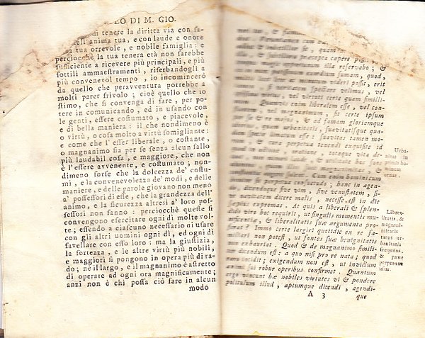 Volume in 16° (mm 170 x 120), pagine 207, iniziali in xilografia, arma o marca tipografica in xilografia nell'ultima pagina. Legatura cartonata pesante coeva. Tracce di etichette cartacee al dorso, manca il frontespizio e 1 o 2 pagine all'inizio, tracce di umidità nelle prime pagine, fino a pagina 16 restauri con perdita parziale di testo nella parte superiore delle pagine, tracce di vecchi tarli agli sguardi dei piatti e nelle ultime pagine. Copia discreta.