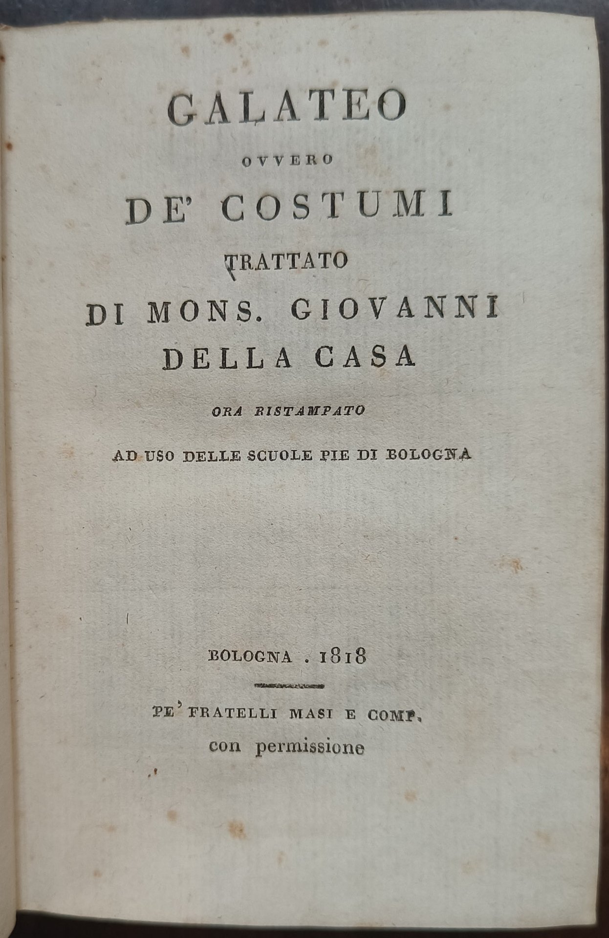 GALATEO OVVERO DE COSTUMI TRATTATO DI MONS. GIOVANNI DELLA CASA ORA BISTAMPATO AD USO DELLE SCUOLE PIE DI BOLOGNA BOLOGNA 1818 PE FRATELLI MASI E COMP. con permissione Bologna, Fratelli Masi e comp., 1818