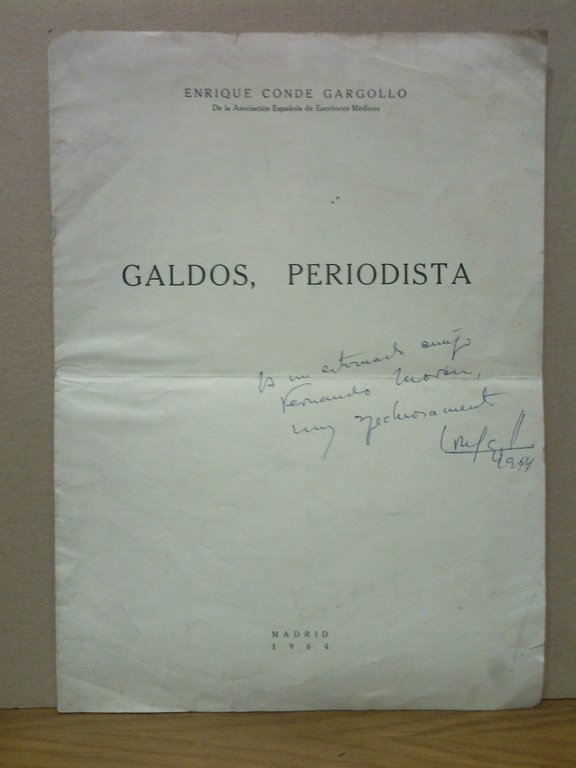 Madrid: [Asoc. Española de Escritores Médicos], 1964.- [2 h.]: con 3 ilustraciones fotográficas de Galdós entre el texto; Folio mayor (33 x 23,7 cm.).- (Páginas Literarias. Asociación Española de Escritores Médicos).* Dedicatoria autógrafa del autor en la cubierta anterior. Con una doblez en su parte central debido al gran tamaño del folleto. LITERATURA Y FILOSOFÍA ESPAÑOLAS DE LOS SIGLOS XIX-XXI Y SU HISTORIA EN GENERAL