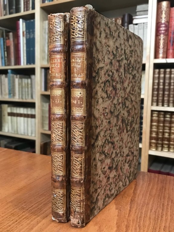 2 volumi in-4° (cm. 22), legature coeve in m. pelle con titolo e fregi in oro ai dorsi (strappi alle cuffie), piatti e risguardi marmorizzati, tagli spruzzati; pp. [6] 136, [4]127 [1] in ottimo stato con 81 (di 82) tavole illustrative in rame f.t. raffiguranti gli antichi (assente il ritratto di Marco Porcio Catone). Edizione poschiavina verosimilmente tradotta dal De Bassus e dedicata al margravio Carlo Federico di Baden. «Nella prefazione è detto autore Guglielmo Enrico Zopf, consigliere di corte di Hohenloe; il pittore e incisore Amadio Federico Riedel ha fornito le incisioni in rame» [Bornatico, Aggiunta, 35]. Questo esemplare contiene l'indice dei ritratti da cui se ne ricava il numero previsto, anche se gli esemplari riscontrati ne contengono quasi sempre meno. Per l'importanza dello stampatore, cfr. M. Berengo, La società veneta alla fine del Settecento, Firenze 1956 p. 305 e L. Santini, La Comunità evangelica di Bergamo, Torre Pellice 1960 p.38, che gli attribuisce l'importante ruolo d'importatore di libri proibiti in Italia. Cfr. anche Thieme- Becker, Künstler-Lexikon, vol. XXVIII, pp.316-317. Ottimo stato di conservazione. (SG2)
