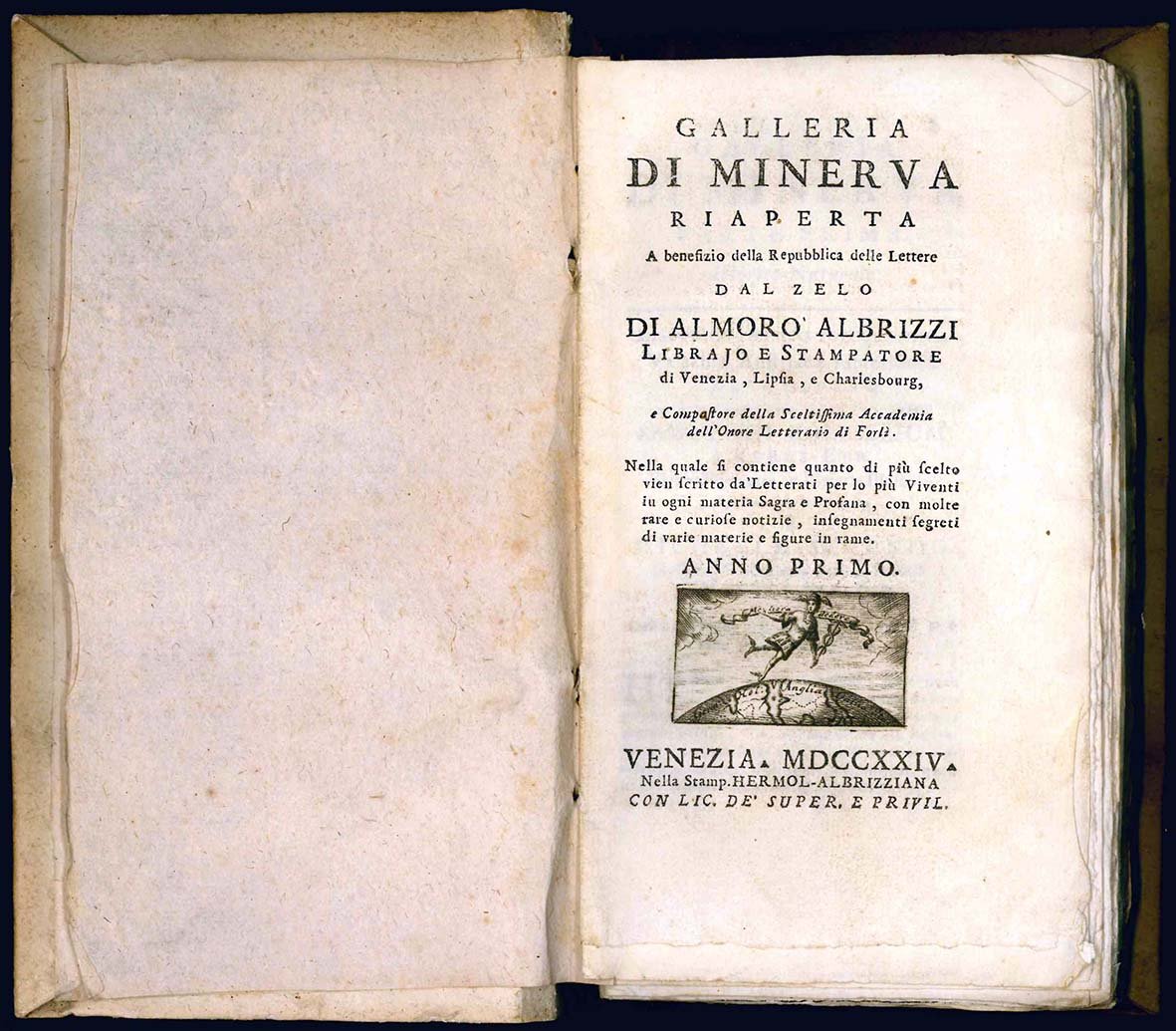 Galleria di Minerva riaperta a benefizio della Repubblica delle Lettere dal zelo di Almorò Albrizzi librajo e stampatore di Venezia, Lipsia, e Charlesbourg, e compastore della sceltissima Accademia dell'Onore letterario di Forlì. Nella quale si contiene quanto di più scelto vien scritto da' Letterati per lo più viventi in ogni materia sagra e profana, con molte rare e curiose notizie, insegnamenti segreti di varie materie e figure in rame. Anno primo.