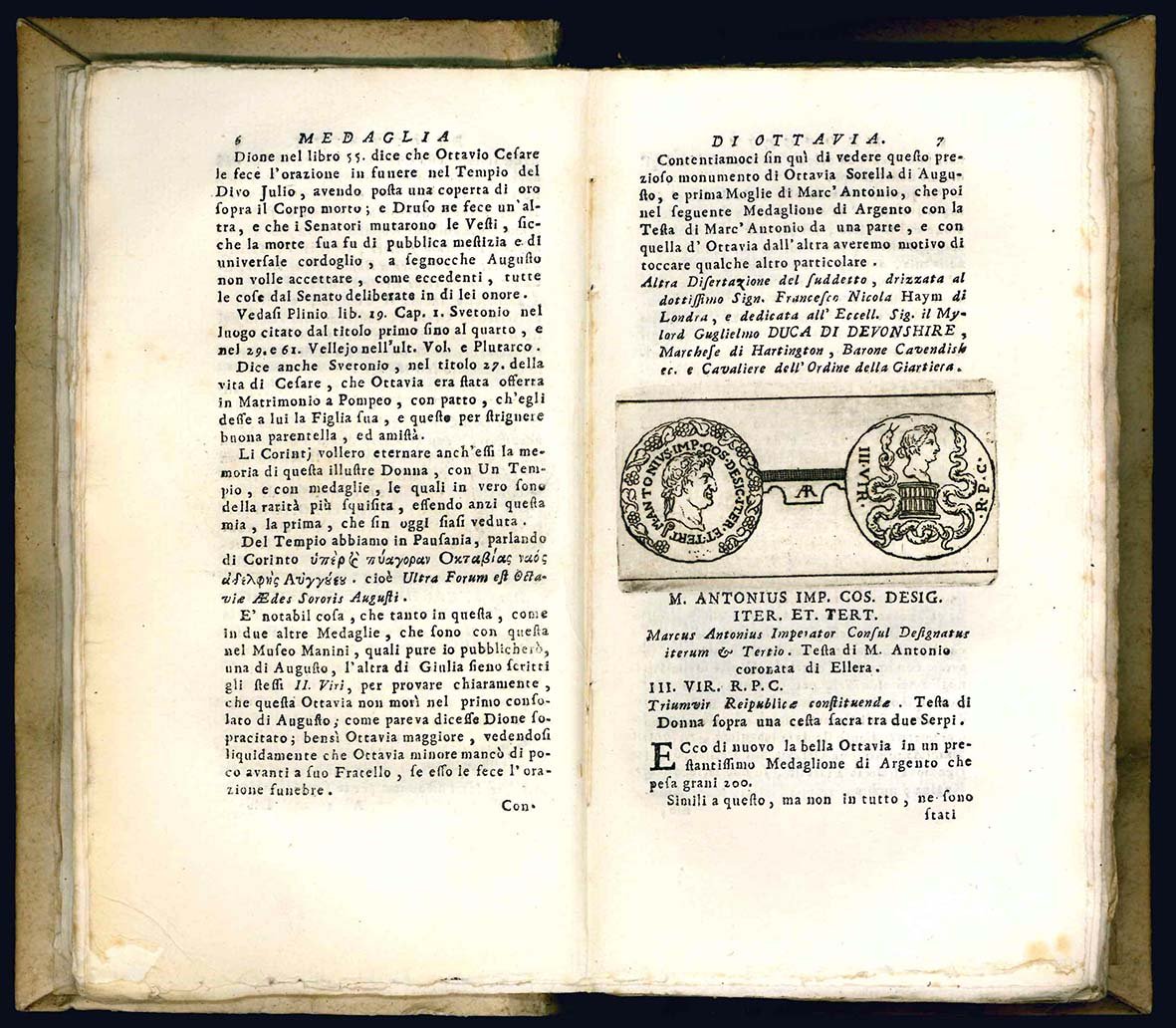 In 12° (170x93 mm); pp. 24, 12, 20, 72 [di 84], 68, 12, 20. Con una incisione al frontespizio e diverse piccole incisioni di monete antiche. Cartone coevo con titolo manoscritto al dorso. Piccolo macchia ad una carta con minima perdita di testo, ma nel complesso ottima copia in barbe.