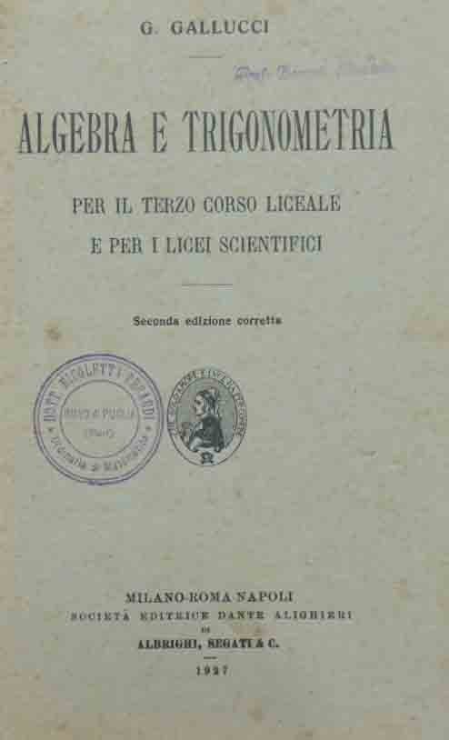 Generoso Gallucci, Algebra e trigonometria. Per il terzo corso liceale e per il licei scientifici, Società Editrice Dante Alighieri di Albrighi, Segati e C., Milano 1927, seconda ed. corretta, pp. VIII, 168, ill. b.n., cm 20, br. ed. Timbri di appartenenza alla prima di copertina, al frontespizio e su diverse carte interne. Tracce d’uso, una piccolissima mancanza al dorso, qualche sgualcitura, minime fioriture, leggera brunitura della carta, ma nel complesso copia ancora in buone condizioni.