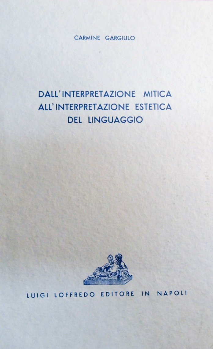 Carmine Gargiulo, Dall’interpretazione mitica all’interpretazione estetica del linguaggio, Luigi Loffredo Editore,Napoli 1964, pp. 46, cm 23, br. ed. Indice: Prefazione – Dall’interpretazione mitica del linguaggio a quella crociana – Le ricerche filosofiche attuali e l’analisi del linguaggio – Conclusione – Bibliografia. Perfetto. Raro.