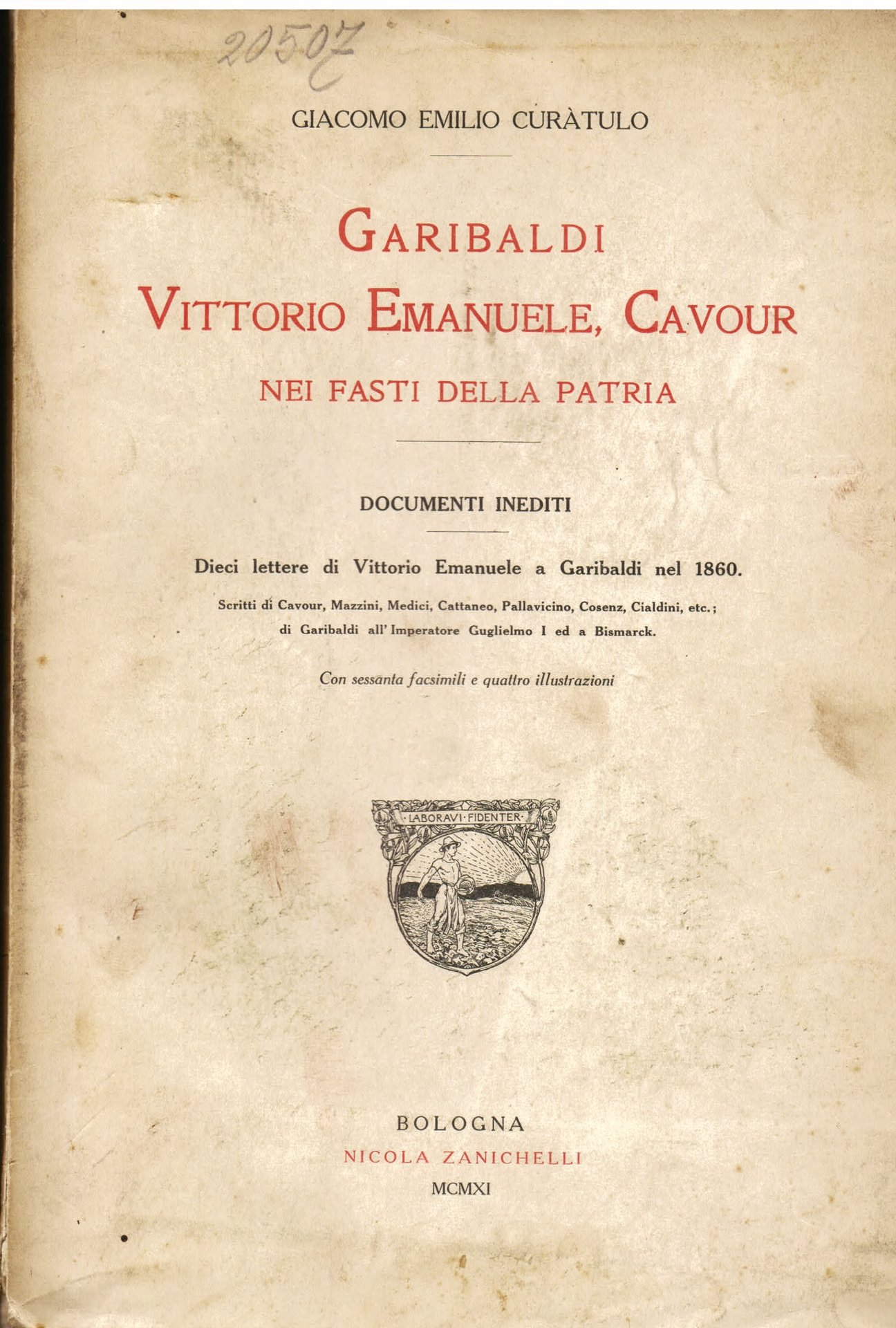 Garibaldi, Vittorio Emanuele, Cavour nei fasti della Patria. Documenti inediti. Dieci lettere di Vittorio Emanuele a Garibaldi nel 1860. Scritti di Cavour, Mazzini, Medici, Cattaneo, Pallavicino, Cosenz, Cialdini, ecc. Lettere di Garibaldi all' Imperatore Guglielmo I ed a Bismarck