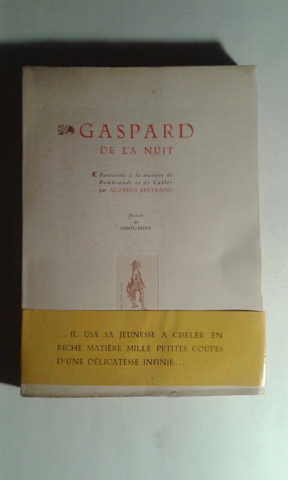ed. 12 Juin 1943 (opera pubblicata per la prima volta postuma nel 1843), con tiratura limitata: "Le tirage comprend 500 exemplairews sur papier à la cuve, numérotés de 1 à 500 et 20 exemplaires hors commerce, numérotés de I à XX". Esemplare n. 495. Testo in francese. VIII/(4)+LXVIII+192/ brossura in cartoncino ruvido avorio, con risvolti e con titoli in nero e rosso e con ornati e marchio con motto in color rame. Con tavole a colori o in b/n f.t. protette da carta lucida semitrasparente (Goltius, H. "Étude" - Ostade (A. Van), "La danse dans la caverne" - Gravure tirée de Lull, R., "Liber de ascensu er descensu intellectus" - Dumonstier, D., "Portrait d'homme" - Troost, E., "Buveurs" - Goya, "Sorcières" - Freminet, M., Esquisse"). Con inoltre riproduzioni di scritti in color rame e cul-de-lampe figurati in color rame. Con fascetta editoriale in carta patinata ocra ("... Il usa sa jeunesse a ciseler en riche matière mille petites coupes d'une délicatesse infinie ..."). Stato buono (lieve usura della copertina - copertina lievemente brunita con piccole fioriture - quasi interamente intonso - pagine brunite). Table: Aloysius Bertrand; Notice par Sainte-Beuve (Charles Augustin de Sainte-Beuve, Juillet 1842) - Gaspard de la Nuit; Aloysius Bertrand - Préface; Gaspard de la Nuit - A M. Victor Hugo (Paris, 10 Septembre 1836) - Les Fantaisies de Gaspard de la Nuit (École flamande (Harlem - Le Maçon - L'Écolier de Leyde - La Barbe pointue - Le Marchand de tulipes - Les cinq Doigts de la main - La Viole de Gamba - L'Alchimiste - Départ pour le Sabbat) - Le vieux Paris (Le deux Juifs - Les Gueux de nuit - Le Falot - La Tour de Nesle - Le Raffiné - L'Office du soir - La Sérénade - Messire Jean - La Messe de Minuit - La Bibliophile) - La nuit et ses prestiges (La Chambre gothique - Scarbo - Le Fou - Le Nain - Le Clair de Lune - La Ronde sous la cloche - Un Rêve - Mon Bisaïeul - Ondine - La Salamandre - L'Heure du Sabbat) - Les chroniques (Maître Ogier (1407) - La Poterne du Louvre - Les Flamands - La Chasse (1412) - Les Reîtres - Les Grandes Compagnies (1364) - Les lépreux - A un Bibliophile) - Espagne et Italie (Le Cellule - Les Muletiers - Le Marquis d'Aroca - Henriquez - L'Alerte - Padre Pugnaccio - La Chanson du Masque) - Silves (Ma Chumière - Jean de Tilles - Octobre - Chèvremorte - Encore un Primtemps - Le deuxième Homme - A M. Sainte-Beuve) - Pièces détachées (Le bel Alcade - L'Ange et la Fée - La Pluie - Les deux Anges - Le Soir sur l'eau - Madame de Mntbazon - L'Air magique de Jehan de Vitteaux - La Nuit d'après une bataille - La Citadelle de Wolgast - Le Cheval mort - Le Gibet - Scarbo - A M. David, statuaire)).