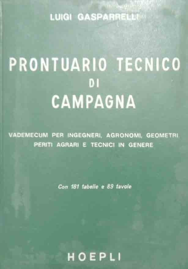Luigi Gasparelli, Prontuario tecnico di campagna. Vademecum per ingegneri, agronomi, forestali, geometri, periti agrari etecnici in genere. Parte tecnica – Parte topografica – Parte agronomica – Parte forestale – parte costruttiva – Parte finanziaria – Parte legale – Parte segnaletica, Editore Ukrico Hoepli, Milano 1975, pp. XV, 379, ill. b.n., cm 21, br. ed. in similpelle con titoli al dorso e al piatto. Leggere tracce d’uso alla brossura, minime fioriture e ingialliture, per il resto ben conservato.