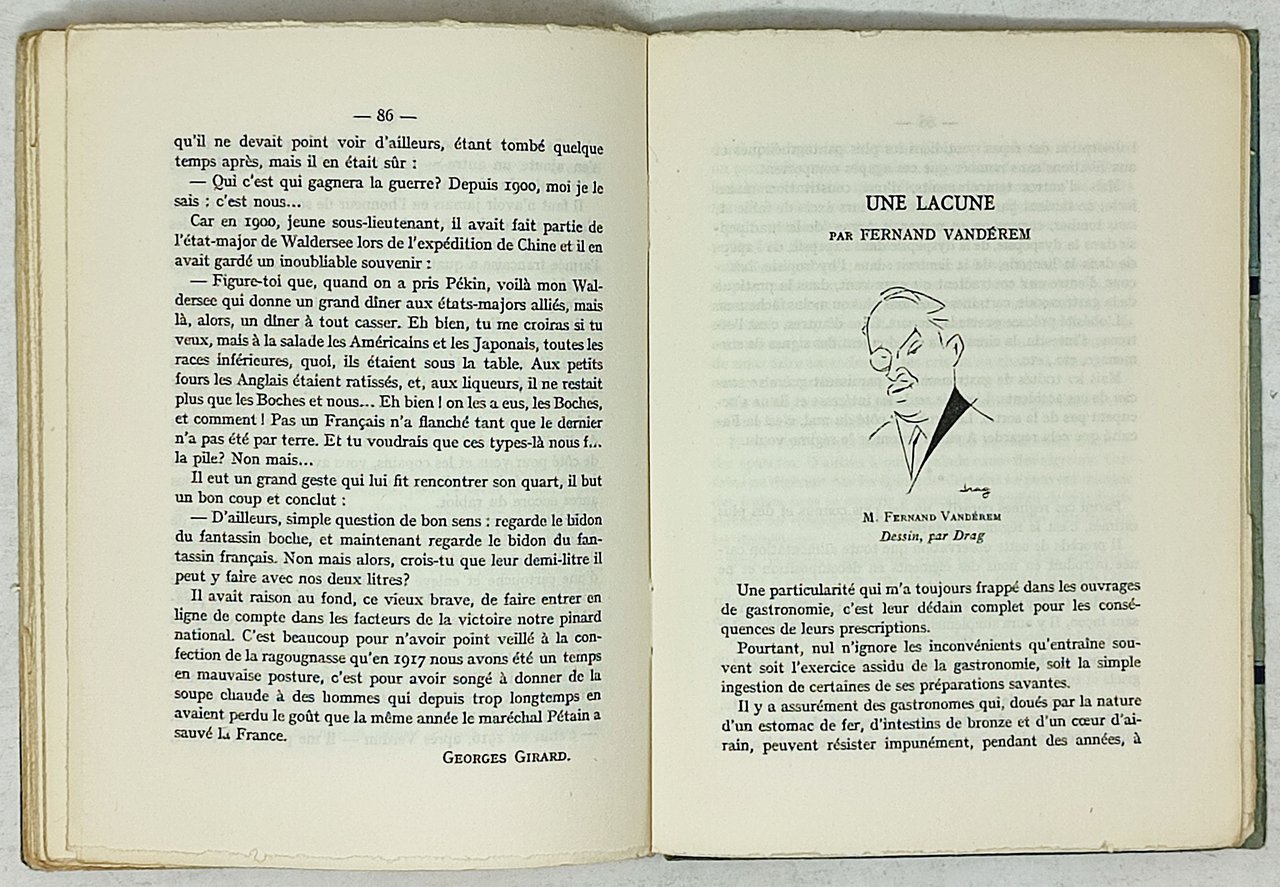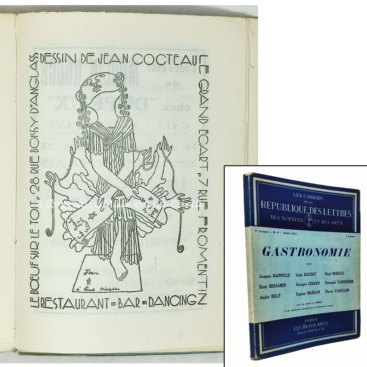 volumetto n° 9 (2° année) della serie 'Les cahiers de la republique des lettres des sciences et des arts - Directeur: Pierre d'Espezel, Redacteur en chef: Georges Brunon Guardia. Noel 1927. Formato: 14,5 x 19,5 cm circa. Belle illustrazioni nel testo di Drag. Indice: Avis aux lecteurs de ce Cahier; Jacques Bainville - Quelques pensees en guise d'avant-propos; Eugene Marsan - Que notre age est l'age classique de la cuisine; Quelques menus des siecles passes; Pieces montees. Dessins par Careme; G. Brunon Guardia - En feuilletant Grimod de La Reyniere; Pierre Varillon - Sur le cuisinier; Leon Daudet - Rehabilitation de l'ail; Paul Reboux - La cuisine en famille; Andre Billy - 'Hosssstelleries'; Rene Benjamin - Le banquet; Georges Girard - La cuisine militaire; Fernand Vanderem - Une lacune; Conclusion: du coté d'Ali-Bab. Da collezione. Di non facile reperimento. Con 20 pagine, non numerate, pubblicitarie. Si segnala una bella tavola pubblicitaria illustrata (in nero) da Jean Cocteau per i ristoranti - bar - dancing 'Le grand Ecart' e 'Le boeuf sur le toit' (stampata su piena pagina). Stato di conservazione: qualche leggerissima abrasione sui margini (superiore ed inferiore) del dorso ma, nel complesso, un esemplare decisamente ben conservato.