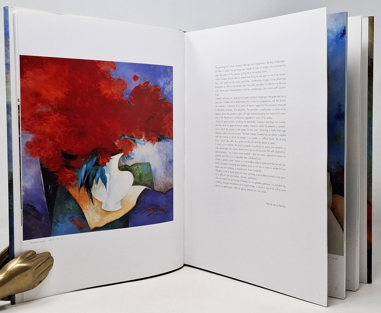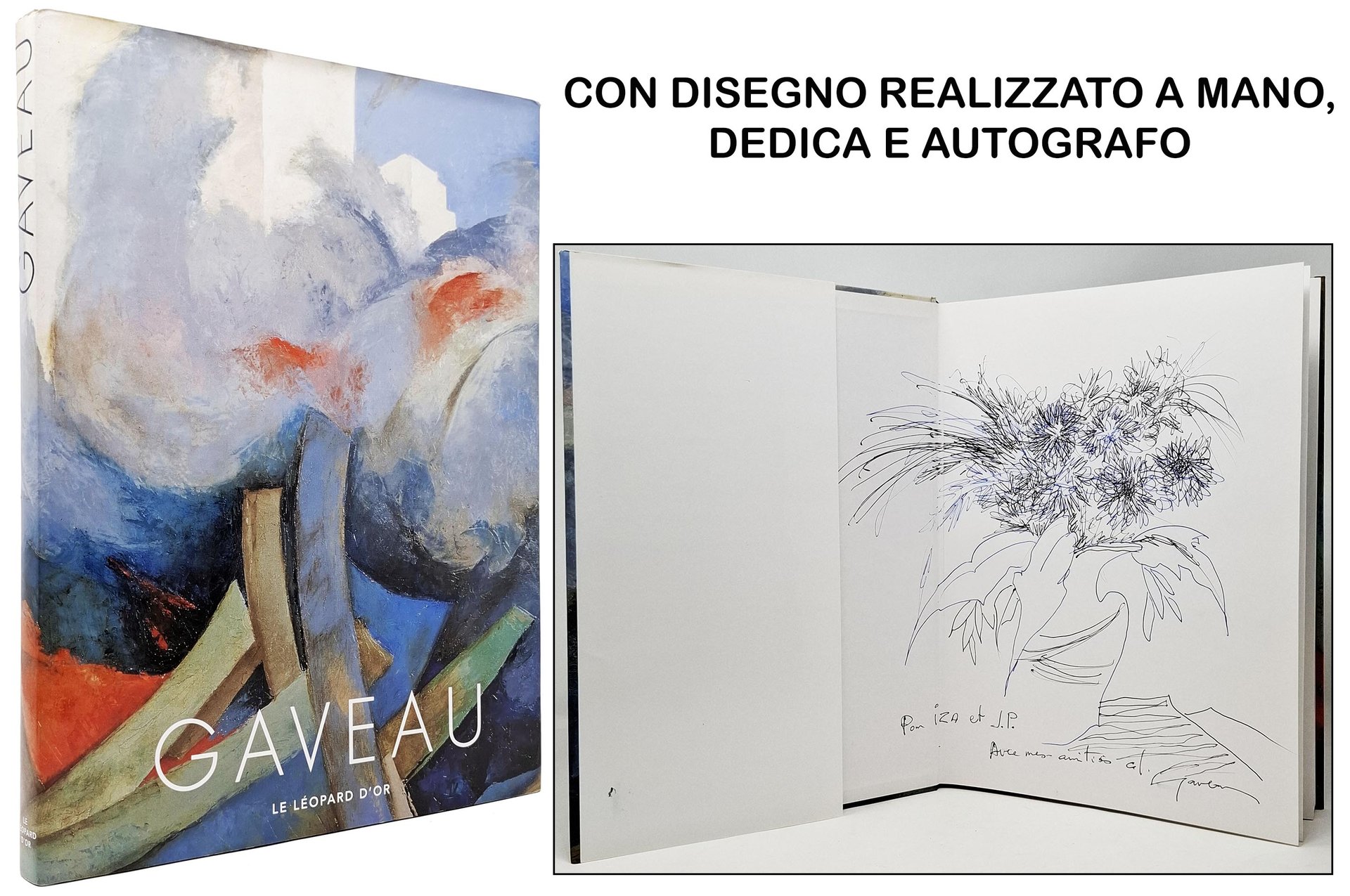 Preface: Patrice de la Perrière. Lingua del testo: francese e inglese (bilingue). Pagine: 169 + [7]. Formato: 25 x 33 cm circa. Esemplare pari al nuovo.Copertina editoriale cartonata rigida, in finitura lucida, illustrata a colori con sovraccoperta (con la stessa illustrazione a colori della coperta). Volume riccamente illustrato con splendide tavole a colori a piena pagina riproducenti le opere di Gaveau. Il volume è impreziosito, sulla prima pagina bianca e sul retro del piatto anteriore, da un ampio disegno a penna nera e blu (un vaso di fiori) realizzato dallo stesso Claude Gaveau con dedica e autografo dell'artista