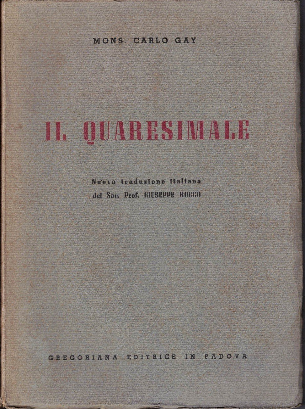 Mons. Carlo (Charles-Luis) Gay, Il quaresimale, traduzione del sac. prof. Giuseppe Rocco, Libreria Editrice Gregoriana, Padova 1946, pp. 492, cm 22, br. ed. Lieve scoloritura al dorso, leggera ombra di gora di modesta estensione al margine inferiore delle prime carte, qualche sporadica sottolineatura a lapis colorato alla prefazione, minime fioriture, lieve brunitura della carta, per il resto e nel complesso esemplare ben conservato.
