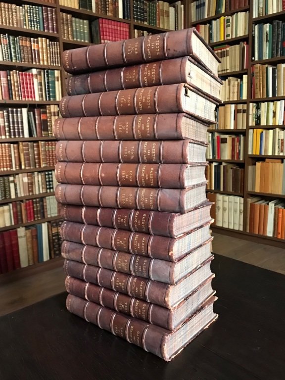 13 volumi in-8° grande (cm. 27), legature coeve in mezza pelle e angoli con titolo in oro ai dorsi (lievissime usure e qualche abrasione ai piatti), tagli marmorizzati; carte in ottimo stato e numerose illustrazioni nel testo e tavole eliografiche fuori testo; sporadiche gore. Volumi della rivista riccamente illustrata (nn.27-28, nn.30-40). Si tratta delle annate complete 1883 (tomi 27-28), 1884 (ma solo la seconda parte ovvero tomo 30), 1885 (tomi 31-32), 1886 (tomi 33-34), 1887 (tomi 35-36), 1888 (tomi 37-38), 1889 (tomi 39-40). Esemplari molto buoni. (NQ5)