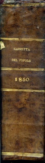 Annata completa per il 1850 dello storico quotidiano torinese. 310 numeri (dal n. 1 del 1° gennaio 1850 al n° 310 del 31 dicembre 1850) in un vol. in-4° (300x200mm), pp. 4 per ciascun numero; di seguito ai numeri della 'Gazzetta del Popolo' sono rilegati anche, a loro complemento, 183 numeri del supplemento alla 'Gazzetta del Popolo' del 1850, 'Omnibus'; tale supplemento, che era allegato solo ad alcuni numeri, consta di poche pagine, talora una sola, e consiste per intero in annunci commerciali. Legatura coeva m. pelle marrone e angoli con titolo e filetti in oro al dorso. Piatti marmorizzati. Alcuni restauri al dorso e qualche traccia del tempo, ma bell'esemplare. Fondato da Felice Govean e dai medici Giovanni Battista Bottero e Alessandro Borella, il quotidiano, fra i più popolari del Risorgimento piemontese, nacque con l'intento di porre a disposizione dei ceti popolari un giornale di piccolo formato e dal costo contenuto (5 centesimi la copia e 12 lire l'abbonamento annuale). Di orientamento filomonarchico e anticlericale, il quotidiano appoggiò la politica cavouriana e il processo di unificazione nazionale; esso cessò le pubblicazioni il 31 dicembre 1983, dopo 135 anni di vita.