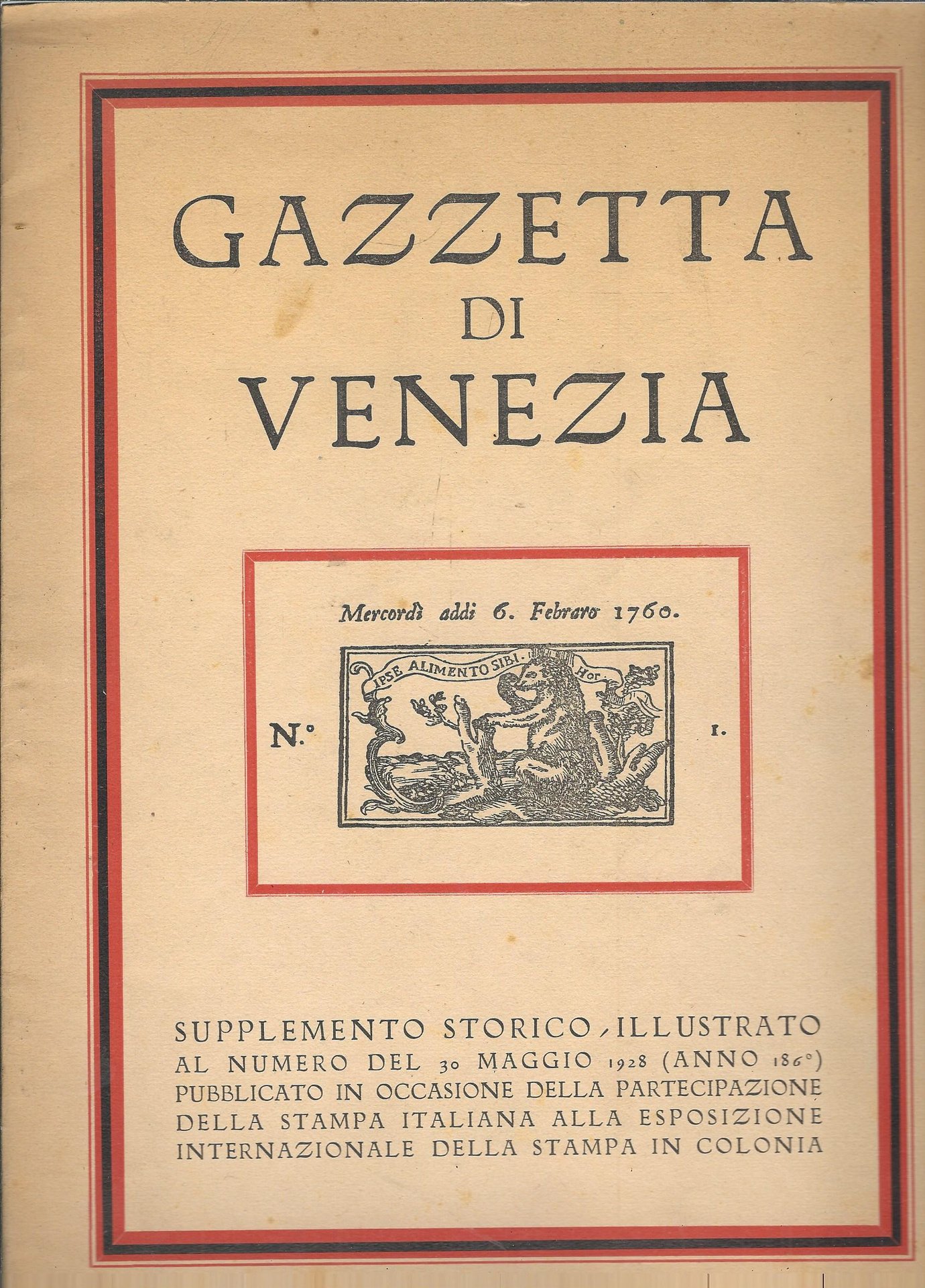 - MERCOLEDI' ADDI' 6 FEBBRAIO 1760-SUPPLEMENTO STORICO ILLUSTRATO AL N°DEL 30 MAGGIO1928 (ANNO 1860)PUBBLICATO IN OCCASIONE DELLA PARTECIPAZIONE DELLA STAMPA ITALIANA ALLA ESPOSIZIONE INTERNAZIONALE DELLA STAMPA IN COLONIA