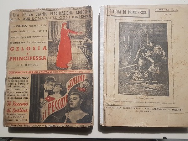 GELOSIA DI PRINCIPESSA 109 DISPENSE IN 2 VOLUMI BROSSURATI OGNI DISPENSA CON UNA ILLUSTRAZIONENELLE DISPENSE E' PRESENTE UN SECONDO ROMANZO A FIGURE A FUMETTI DEL TIPO NUOVO AMERICANO IL PECCATO DI EVELINE DI L. DE SANTIS SCENEGGIATO DA PIERNAND SINO ALLA DISPENSA N 22DALLA DISPENSA 23 INIZIA UN NUOVO ROMANZO A FUMETTITU SEI L'AMORE DI JOHN RALF ILLUSTRATO E DISEGNATO DA G. PESCADOR SINO ALLA DISPENSA 40DALLA DISPENSA 41 TERZO ROMANZO DALLA NOTISSIMA SCRITTRICE NERINA MAJORINO JORI: UNA DONNA PIANGE SCENEGGIATO DA PITTORE BIFFI SINO ALLA DISPENSA 59DALLA DISPENSA N 76 INIZIA IL BEL GALANTINO QUARTO E ULTIMO ROMANZO A FUMETTI DEL CELEBERRIMO ROMANZO ITALIANO I CENTO ANNI DI GIUSEPPE ROVANI REALIZZATO DA UN GRANDE DISEGNATORE MODERNO RIDUZIONE PINO MONTREAL REALIZZATORE Z.B. MAGIZ(non completo perche' il secondo volume termina con la dispensa n 109 al termine del romanzo gelosia di pricipessa) RARISSIMO PROBABILMENTE UNO DEI PRIMI VOLUMI DELLA CASA EDITRICE LA MADONNINA DI MILANO