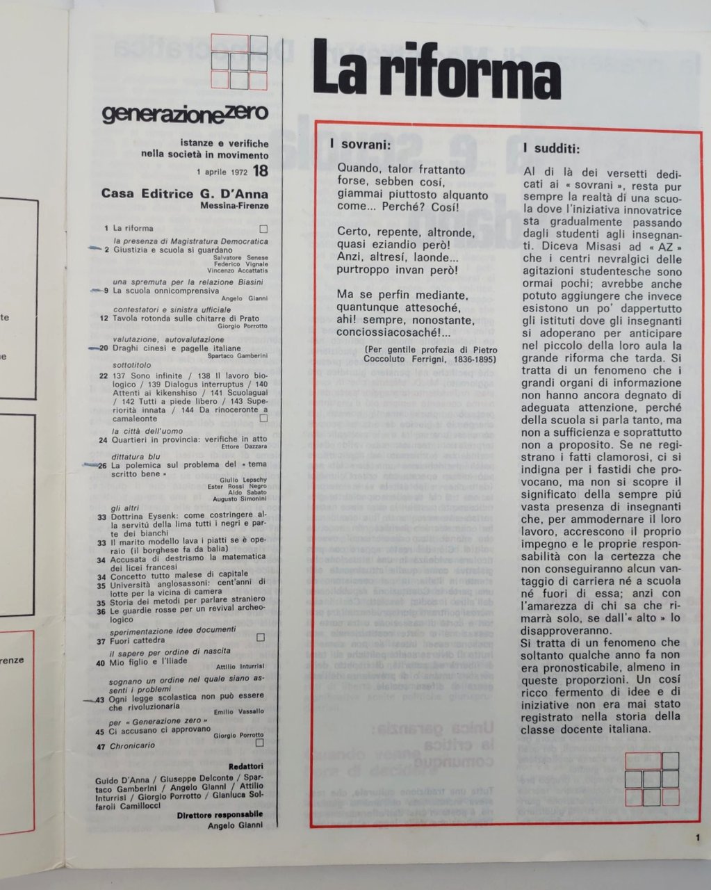 Numero di questa rivista uscita tra 1970 e 1973, distribuita gratuitamente dalla Casa editrice D'Anna ai professori, dedicata al mondo e alle tematiche giovanili. Si proponeva di evidenziare i problemi dell'istruzione media e di rimuovere le posizioni stagnanti delle istituzioni scolastiche. In questo numero: A. Gianni, Il ponte che abbiamo perduto; G. Porrotto, Meglio di no per la religione e per la repubblica; S. Gamberini, La cultura ovvero la pornografia sublimata; A. Marchese, La pedagogia della mela marcia; Luciano Cherchi, Ore 9: lezione happening; ecc