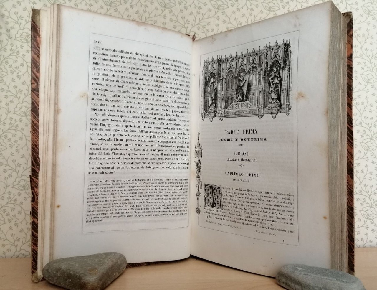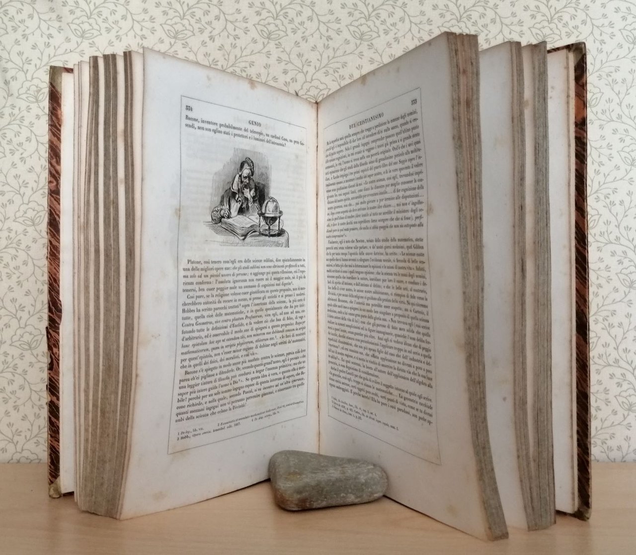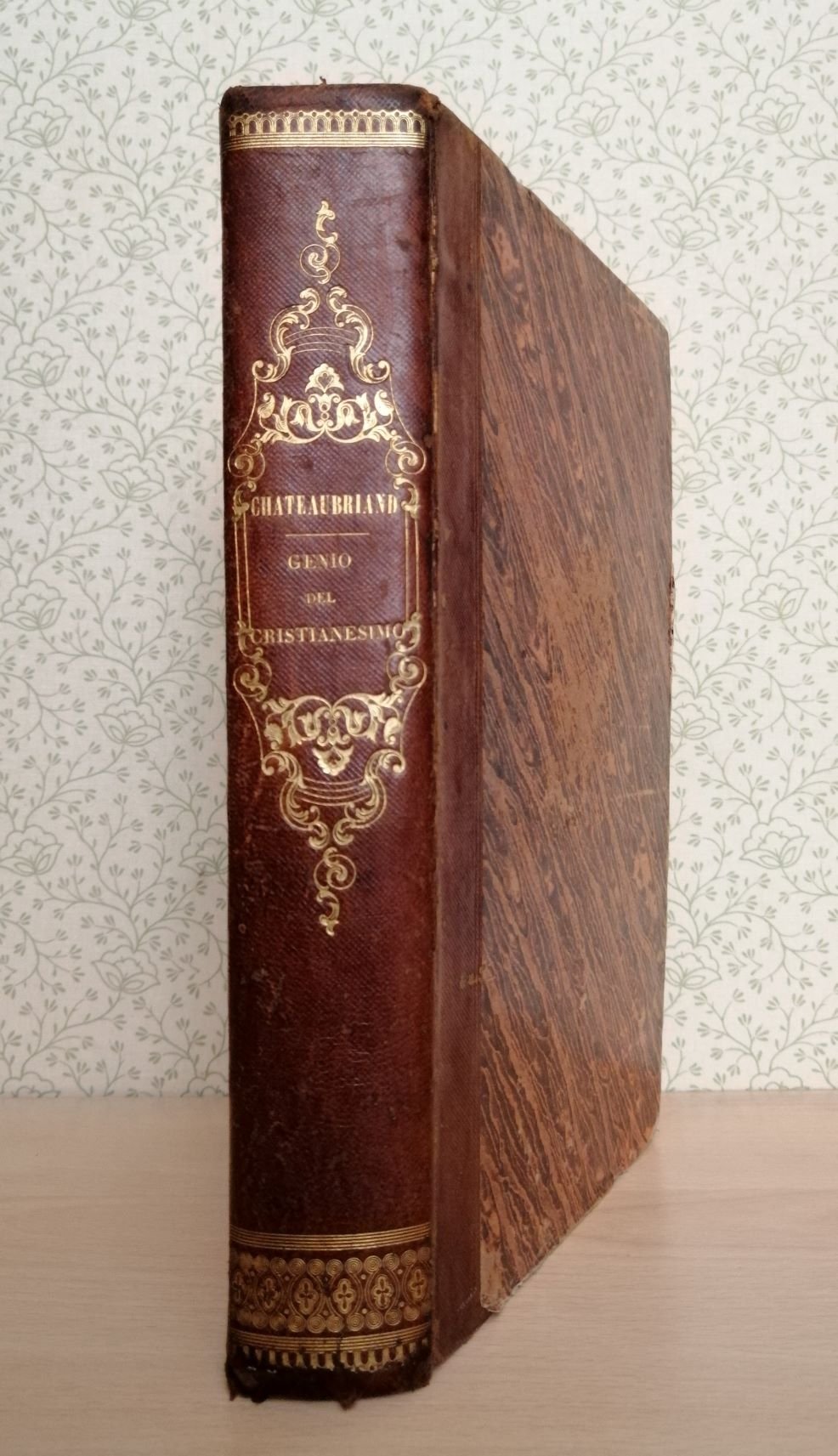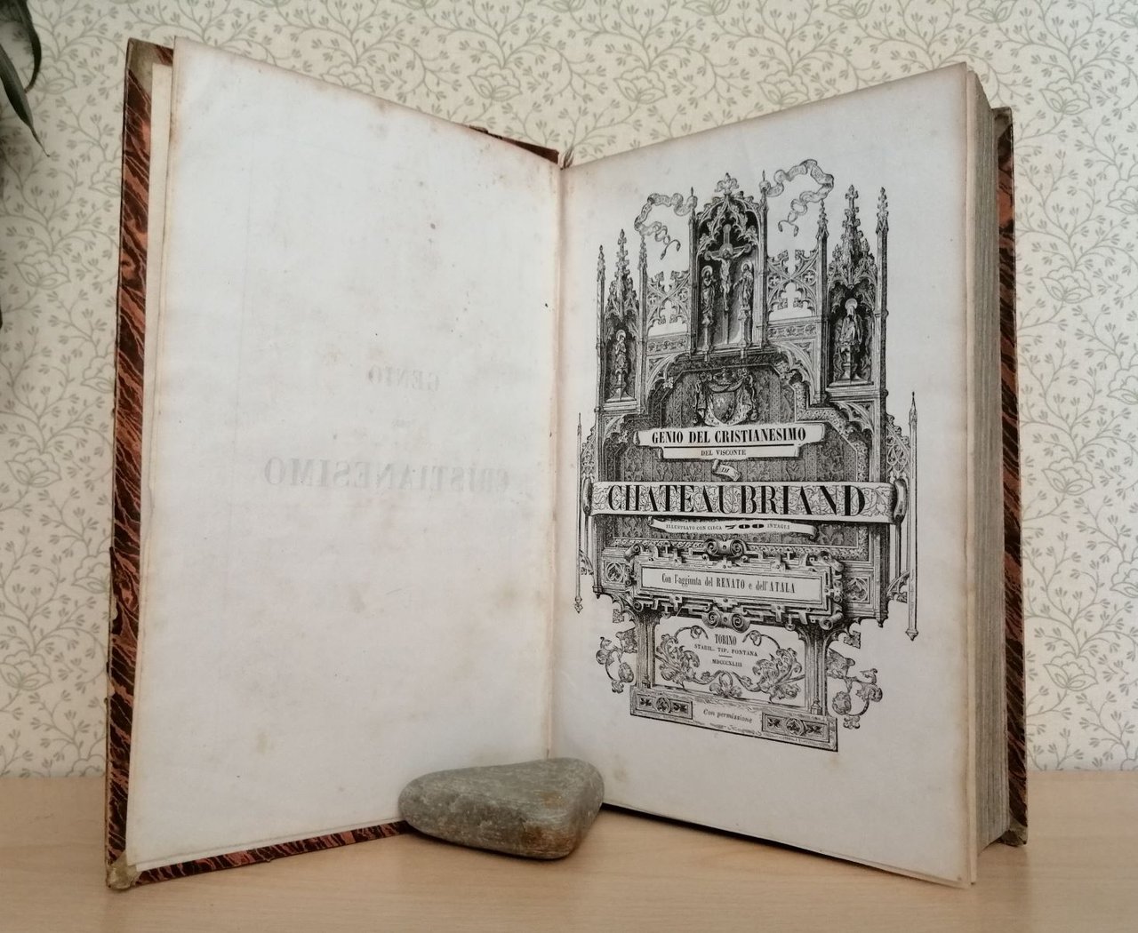 Volume in 4, legatura coeva in mezza pelle, titolo inciso al dorso ornato da fregi in stile romantico impressi e decorati in oro, taglio colorato, ex libris al verso del piatto, sguardie, occhiello, magnifico frontespizio figurato in xilografia, prefazione e introduzione di A. Fontana, notizie biografiche sull'autore, XXVIII, 728 pp., circa 700 vignette xilografiche n.t., testatine e capilettera ornati, testo racchiuso in cornice. Opera concepita allo scadere del secolo dei Lumi col principale intento di dare un'articolata illustrazione del mondo cristiano a correzione dell'entusiasmo rivoluzionario che ha tentato di cancellarlo, dimostrandone la superiorit morale ed estetica. Un libro vessillo, colonna portante del romanticismo, specchio di un'et di transizione particolarmente complessa e drammatica. Qui presentato in una delle prime versioni italiane, 'in miglior guisa' delle precedenti, questa edizione del grande A. Fontana (famiglia di editori originaria di Biella) si raccomanda per la dovizia degli ornamenti e delle suggestive pittoresche illustrazioni xilografiche. In bello stato. Lievi mende alla legatura e tipiche sporadiche fioriture dovute al tipo di carta.
