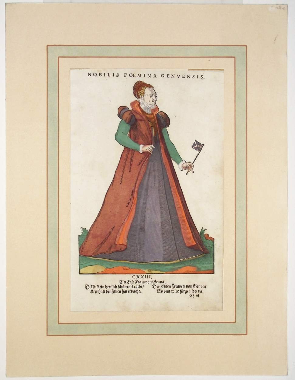 >Silografia originale, foglio di mm 200x310, costumi di nobili e popolani delle varie città d'Italia. Gli elaborati abbigliamenti sono assai fedeli alla moda del tempo e costituiscono una straordinaria documentazione. Eccezionale esemplare, freschissimo e con splendida colorazione strettamente coeva; rarissimo in queste condizioni. La spessa colorazione, esalta soprattutto gli arancioni e i viola.