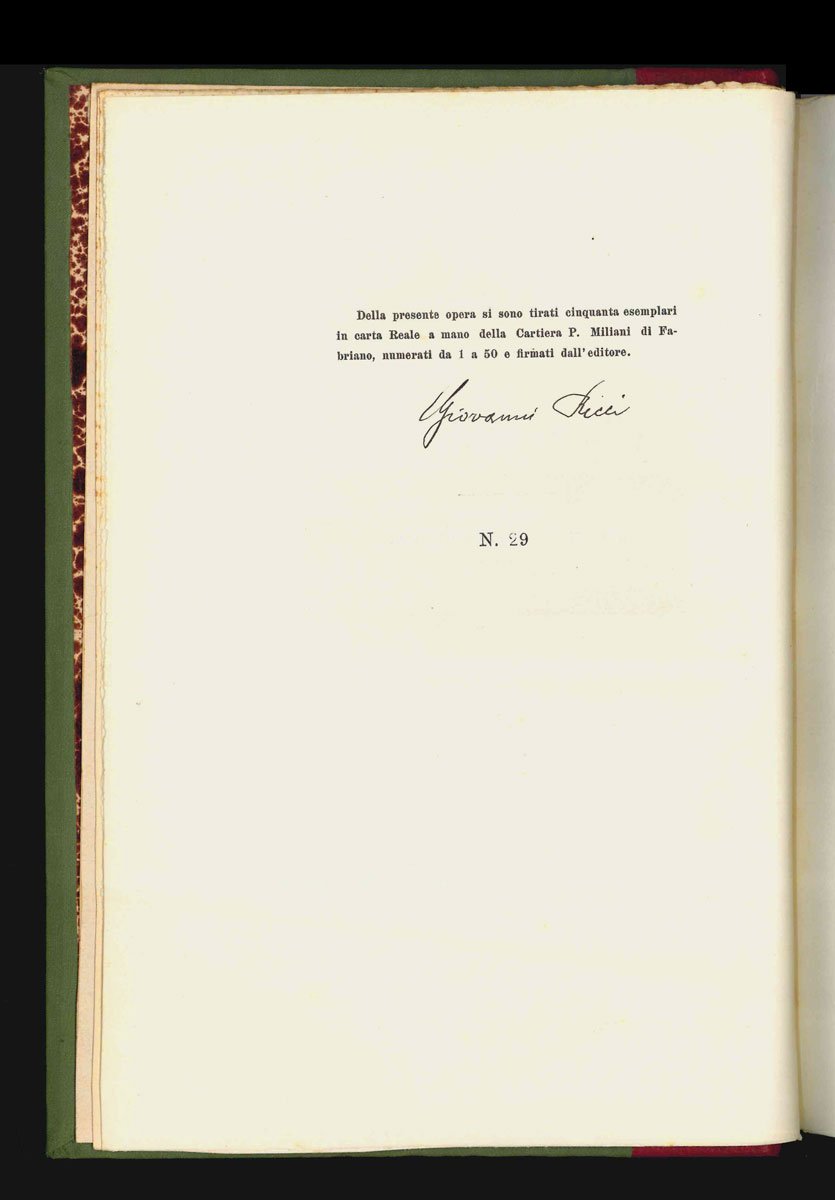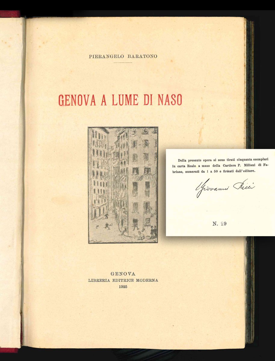 LIBROPrima edizione, tiratura di testa.Esemplare n. 29 dei soli 50 numerati in carta Reale a mano di Fabriano, firmati dall’editore Giovanni Ricci, fondatore della Libreria Moderna; in gradevole legatura d’epoca con ex libris xilografico «per correr miglior acque Prof. Nicolò Filippi»; conservato il piatto superiore della copertina originale; a fogli chiusi, in eccellente condizioni (fioriture ai tagli).Rarissima tiratura di testa numerata in sole 50 copie in «carta Reale» formato ottavo (la tiratura comune è in normale carta uso mano e in sedicesimo). Raccolta di prose dedicate alla città e ai suoi personaggi, ornata dalle incisioni tratte dai disegni Giglioli, tutte concentrate nelle prime pagine del libro. In chiusura una canzone in endecasillabi, «A te, Genova». -- Pierangelo Baratono, fratello minore del leader socialista Adelchi, fu un personaggio memorabile della Genova del primo Novecento: noto per gli atteggiamenti sregolati da crepuscolare maledetto, fu amico di Sbarbaro, Roccatagliata Ceccardi e Montale. Questo suo libro di memorie è un prezioso documento per studiare la cosiddetta “linea ligure” della letteratura italiana del primo Novecento, oltre che un sentito peana al capoluogo ligure.