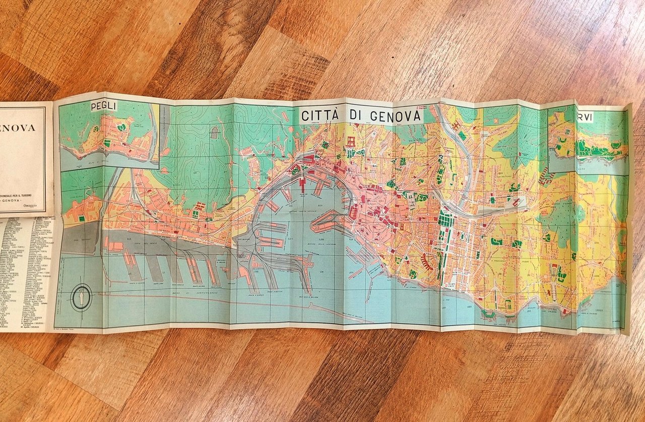 Senza data di stampa, intorno alla metà del Novecento. Cartina a colori stampata presso le Officine grafiche Mondadori, Verona -- Opuscolo contenente una mappa più volte ripiegata a fisarmonica; al retro della stessa sono stampate indicazioni turistiche in italiano, francese, inglese e tedesco (vedi immagini). Esemplare in buono stato di conservazione.