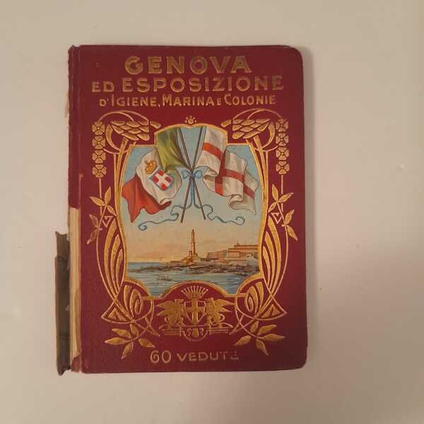 Volume in 16° contenente 30 vedute di Genova a cartolina e degli stabilimenti costruiti per l'Esposizione del 1914, cartoline a leporello in bianco e nero, nelle due pagine interne delle copertine cartina di Genova a colori, rotto il dorso senza mancanze.